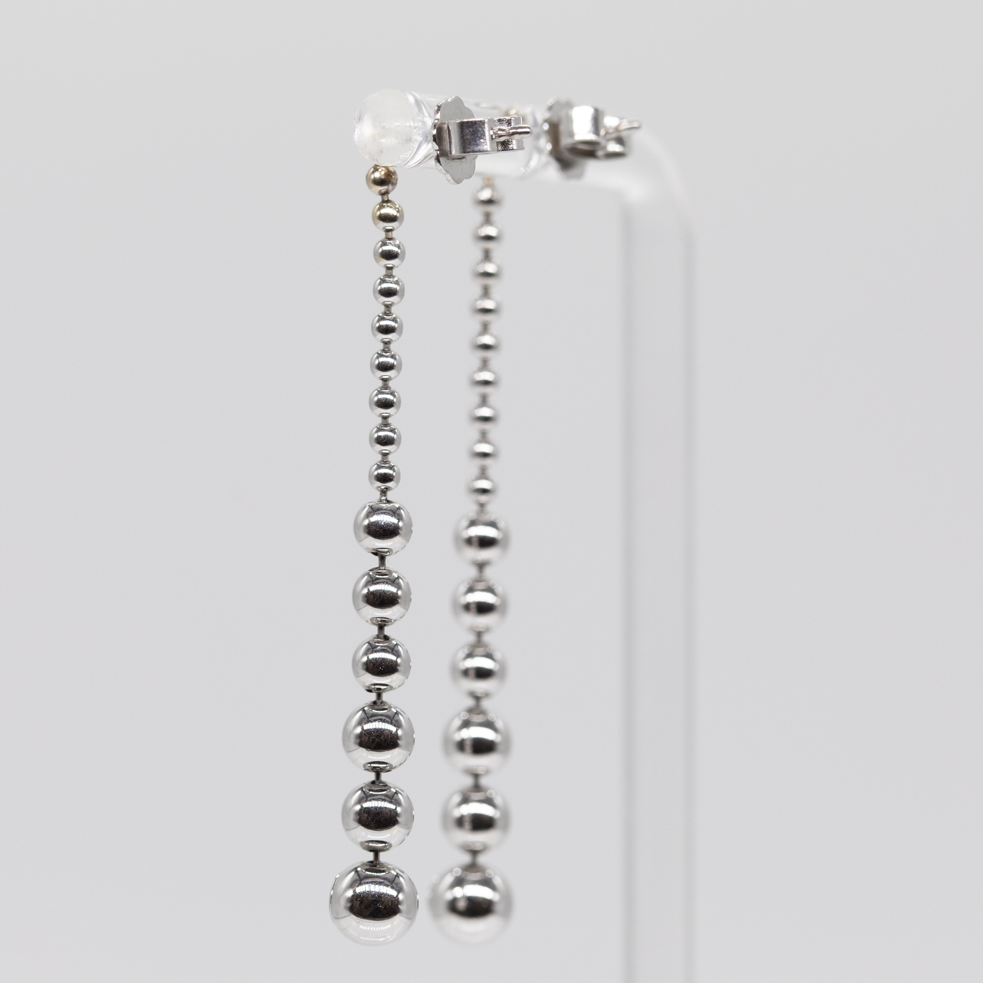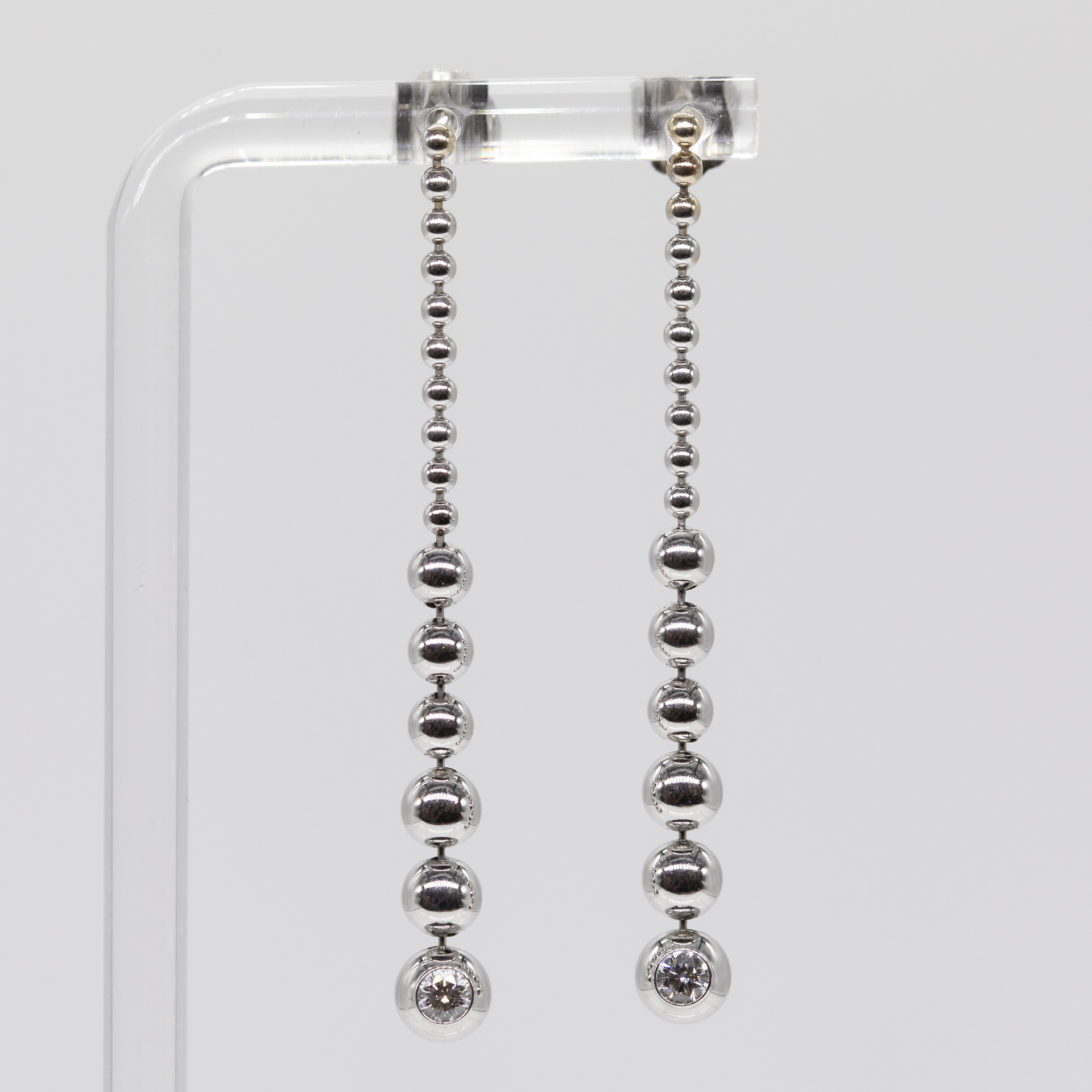 750/- Weißgold; Gesamtgewicht ca. 10,9 g.; 16 aneinandergereihte Kugeln im Verlauf vom Durchmesser ca. 2,1 mm bis ca. 5,8 mm; an der letzten Kugel jeweils ein gefasster Brillant, zus. ca. 0,3 ct; Farbe: F-G; Reinheit: VSI+; Gesamtlänge ca. 5,6 cm.