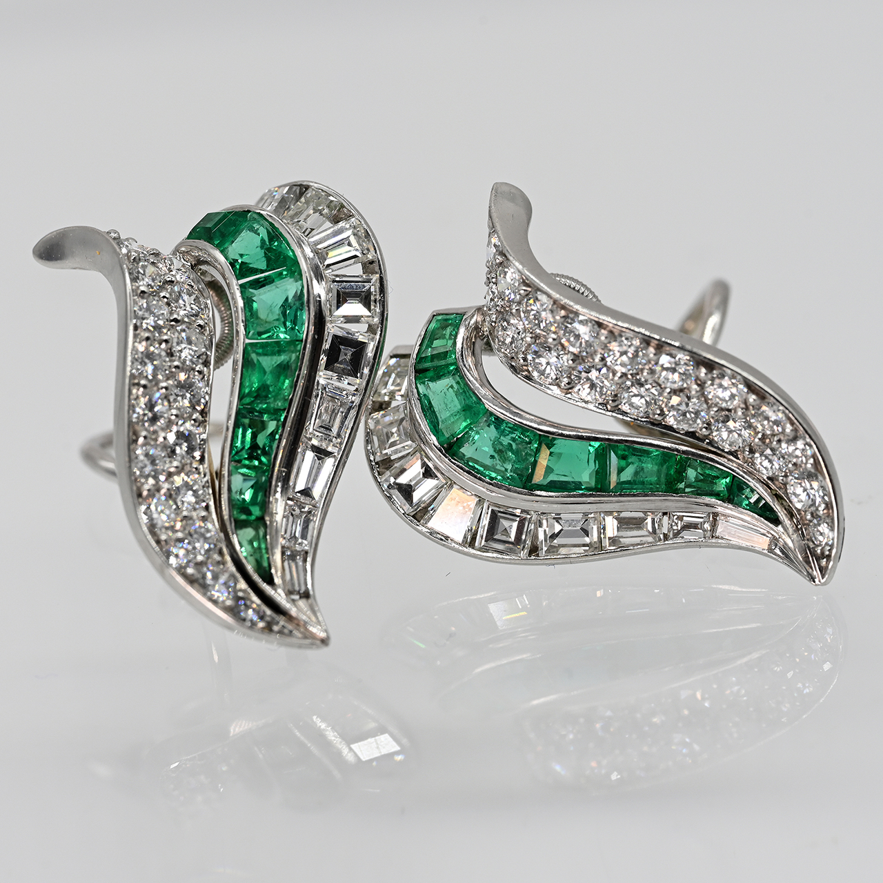 950/- Platin; Gesamtgewicht: ca. 11,7 g; stilisierte, geschwungene Dreiecksform, in drei lineare, getreppte Felder gegliedert; mittig jeweils 7 hochfeine Smaragde, zus. ca. 1,9 ct; seitlich je 9 Diamant-Baguettes, zus. ca. 1,8 ct; Farbe: E-G; Reinheit: VS-VVS; seitlich je 19 Brillanten, zus. ca. 1,6 ct; Farbe: E-H; Reinheit: VVS-VS; Clipmechanik; rückseitige Punze; Maße: ca. je 25,8 x 15,4 mm.