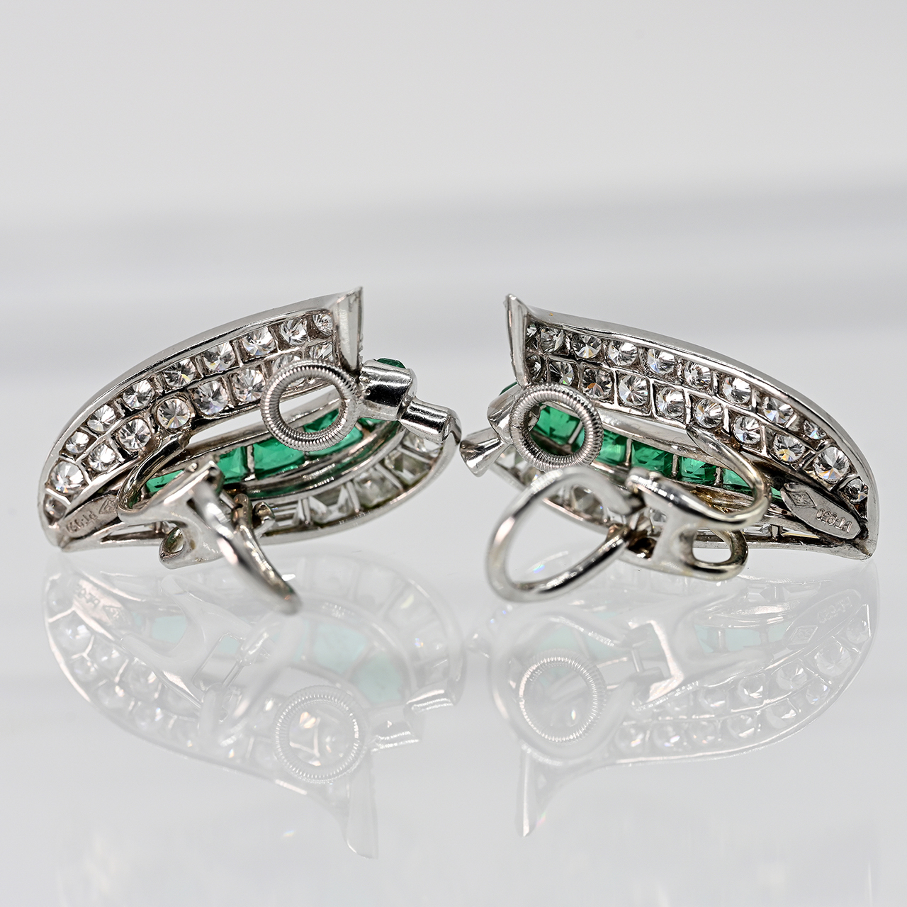 950/- platinum; total weight: approx. 11.7 g; stylised, curved triangular form divided into three linear, stepped sections; centre of each set with 7 fine emeralds, total approx. 1.9 ct; flanked by 9 baguette-cut diamonds on each side, total approx. 1.8 ct; colour: E-G; clarity: VS-VVS; bordered by 19 brilliant-cut diamonds on each side, total approx. 1.6 ct; colour: E-H; clarity: VVS-VS; clip mechanism; maker’s mark on the reverse; dimensions: each approx. 25.8 x 15.4 mm.