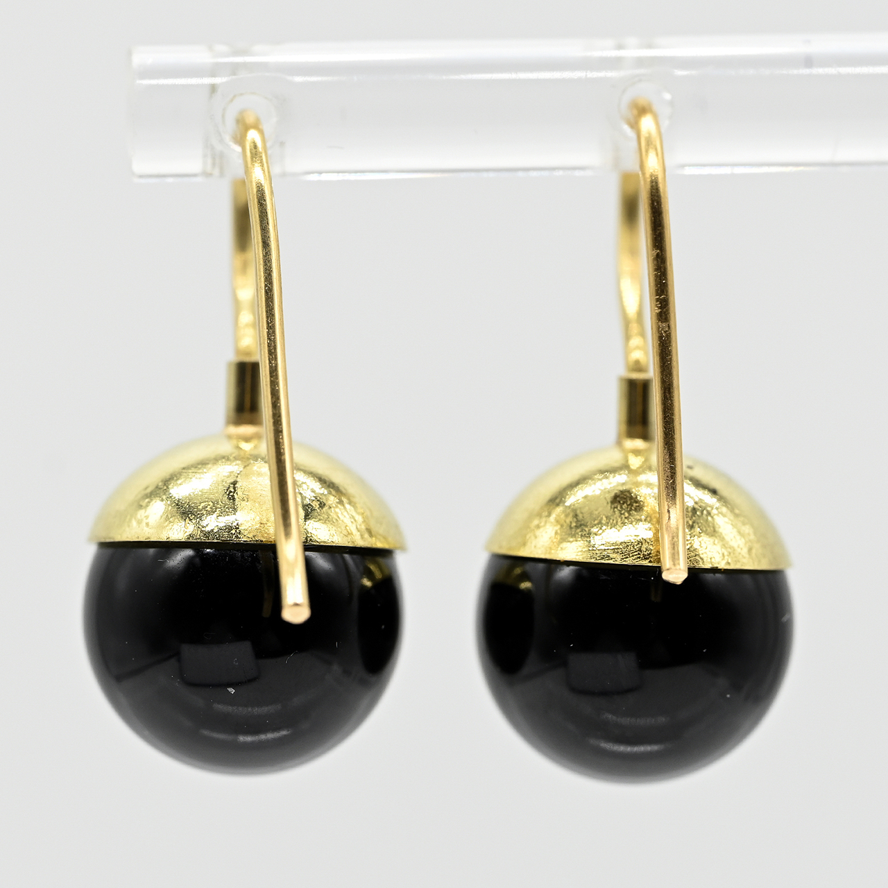 750/- yellow gold mount and curved hook fittings; total weight: approx. 8 g; set onyx beads; diameter: approx. 12.3 mm; total length: approx. 25.3 mm.