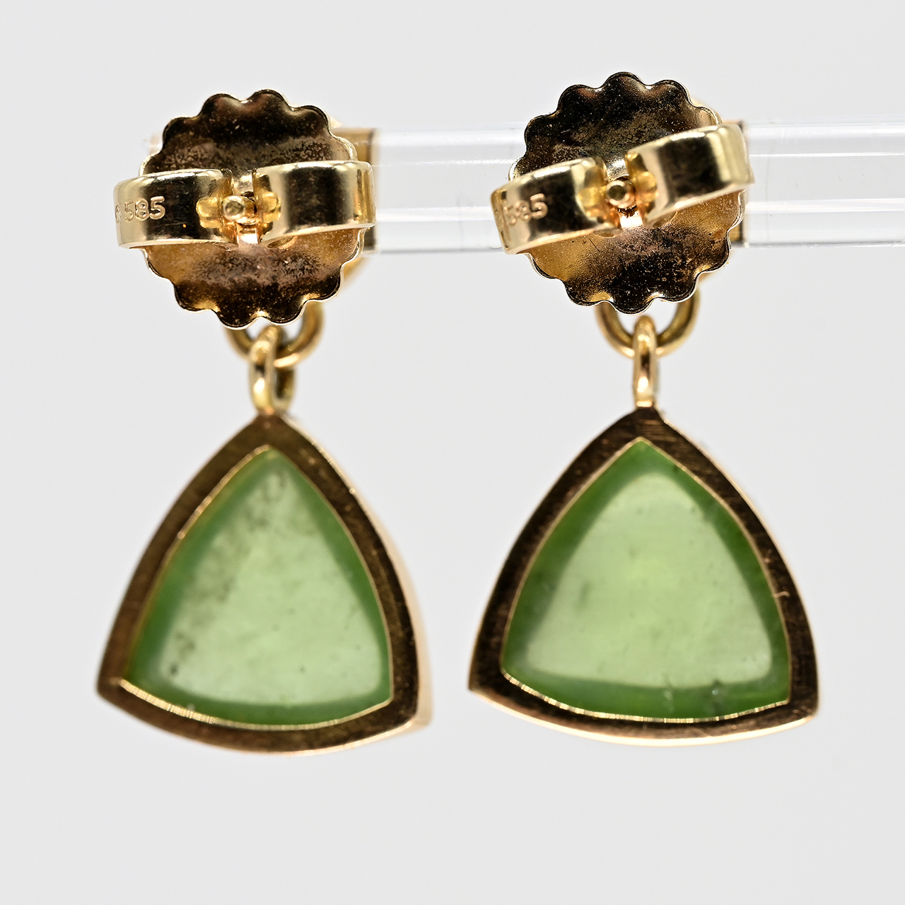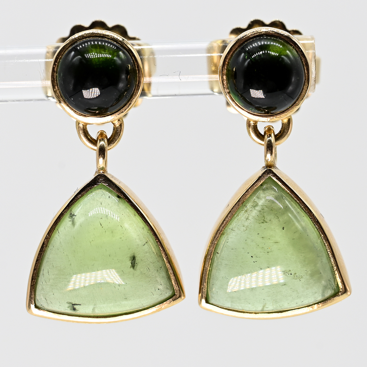 750/- Gelbgold; Gesamtgewicht: ca. 8,9 g; untereinander hängende runde und trapezförmige Zargenfassungen; Durchmesser: ca. 8,2 mm und Schenkellänge: ca. 13,7 mm; jeweils mit einem Turmalin-Cabochon ausgefasst, in dunkelgrüner und hellgrüner Farbvarietät; Gesamtlänge: ca. 25,8 mm.