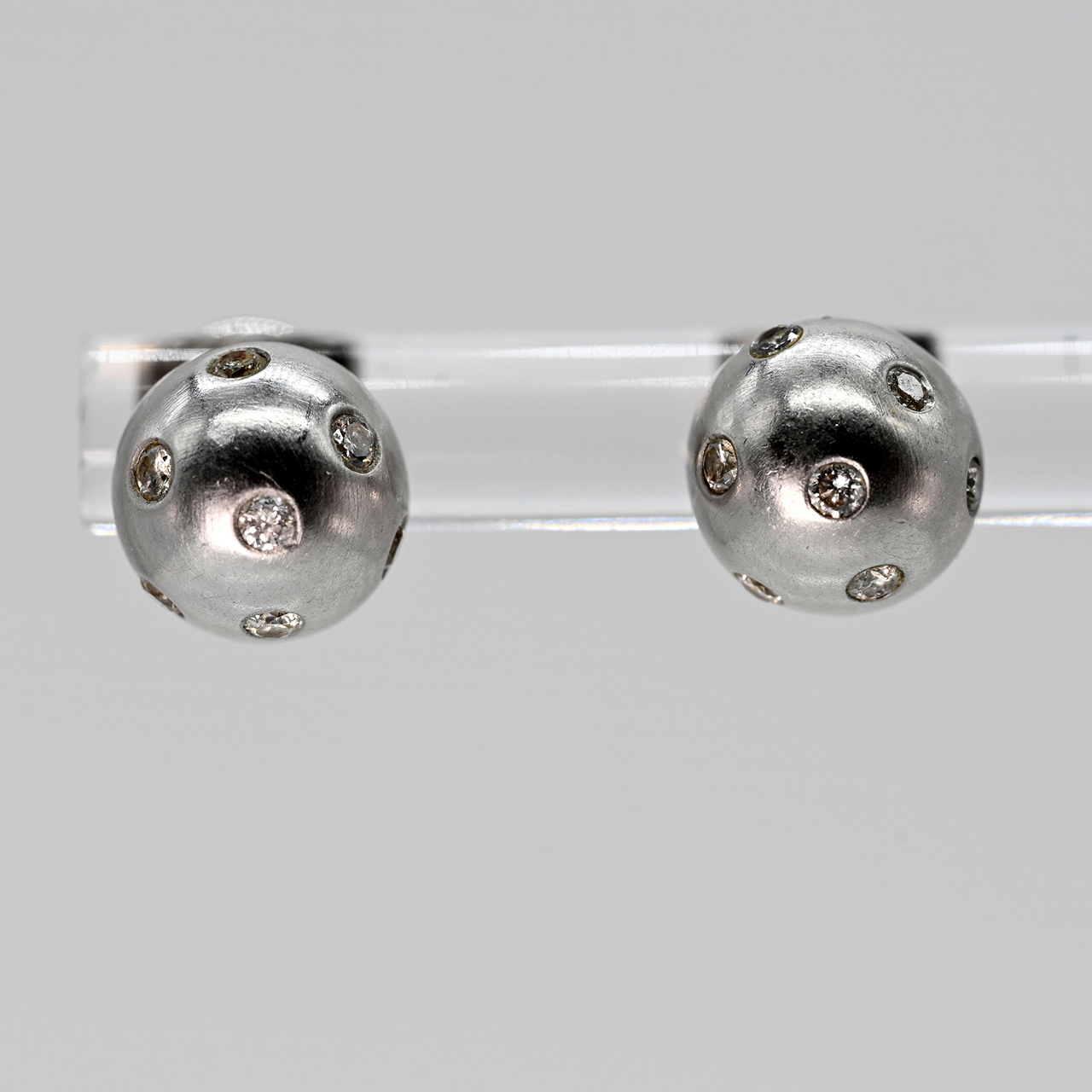 585/- Weißgold; Gesamtgewicht: ca. 2,6 g; Halbkugel mit je 7 gefassten Melée-Brillanten, zus. ca. 0,12 ct; Farbe: mittlerer Bereich (G-I); Reinheit: mittlerer und unterer Bereich; satinierter Oberflächendekor; Durchmesser: ca. 7,8 mm; Höhe: ca. 6,2 mm; Brillanten mit leichten Gebrauchsspuren an den Facettenkanten.