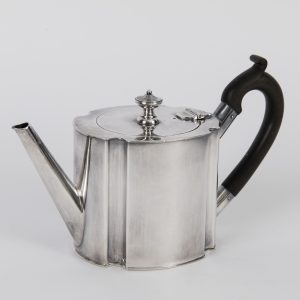 Plated; weight: approx. 344 g; teapot with quatrefoil, curved body, low-set cylindrical spout, ear-shaped handle made of ebonised wood and hinged lid with mushroom-shaped handle; stamped and numbered on the underside; age-related signs of wear; height: approx. 11.5 cm; weight: approx. 344 g.