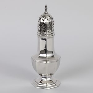 Sterling silver; weight: approx. 267 g; sugar caster in octagonal baluster form on an eight-faceted base, with a raised faceted neck and detachable cover, pierced with floral ornamentation, executed as a caster with a small knob; both parts stamped on the side with town mark, date letter, Lion Passant as well as maker’s mark; punctual nick on the outer base ring of approx. 1 mm; in the original case with some signs of use; total height of the sugar caster: approx. 21 cm.