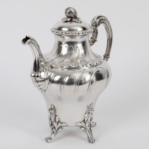 800 silver; weight: approx. 666 g; coffee pot with high-set bulbous body, vertically gadrooned, on four claw feet with acanthus leaf décor, high-set spout, ear-shaped handle with ornamental décor and Bakelite applications as well as hinged lid with surrounding ornamental frieze and handle in the form of a fruit with finely chased foliage; several fine superficial scratches and age-related signs of wear; underside stamped with crescent moon and crown, fineness mark as well as maker’s mark and model number; height: approx. 23.5 cm.