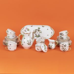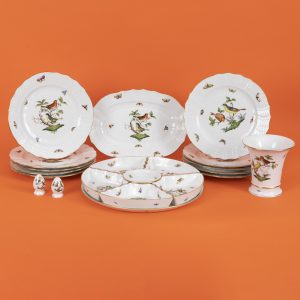White porcelain with polychrome “Rothschild” décor and gilt decoration, “Altozier” relief; lids with applied rose finials and ear-shaped handles with leaf design; 21-piece dinner service comprising: 6-piece cabaret (height: approx. 4.8 cm; diameter: approx. 37 cm), salt and pepper shakers (height: each approx. 6 cm), 10 dinner plates (diameter: approx. 27.5 cm), vase (height: approx. 15.5 cm), oval serving platter (dimensions: approx. 34 x 24 cm); total weight: approx. 11.1 kg.