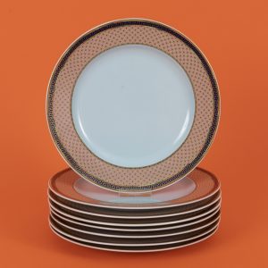 White porcelain with polychrome décor and gilt accents; form “Ikarus” by Paul Wunderlich; round breakfast plates with light blue centre and surrounding diamond pattern on a rosé-coloured band, and a border with a classical meander motif on a dark blue ground, rim framed by golden lines; one plate with a scratch on the centre of approx. 2.3 cm; as new; underside with manufacturer’s and designer’s emblem and marks (blind stamp, model number). Dimensions: approx. ⌀ 22.6 cm; total weight: approx. 2.8 kg.