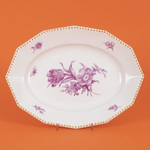 White porcelain with manganese-coloured floral painting; serving platter with large flower bouquet and butterfly painting in the oval well and fine floral painting on the flared scalloped rim with gilt beaded border decoration; well-preserved condition with age-related signs of wear; underside underglaze stamped with manufactory marks and a number; dimensions: ca. 4.5 x 32.7 x 24.5 cm; weight: ca. 943 g.