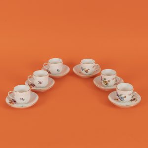 White porcelain with polychrome painting “Flowers and Butterflies”, gilt accents and rims; service shape with fine relief in basket or wickerwork pattern, small flower and leaf applications, and fluted saucer rims and vessel walls; comprising: 6 mocha cups (height: ca. 5.4 cm) and 6 saucers (diameter: ca. 11.3 cm); 1st quality and very good condition with minimal signs of use; underside each with older blue sceptre mark, red orb as well as various painter’s marks and impressed marks; total weight: ca. 820 g.
