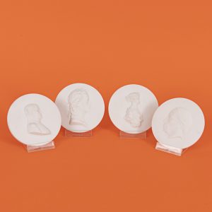 White biscuit porcelain on round base; lot of commemorative plaques, comprising: 1) bust in profile of Napoleon Bonaparte after a model by Leonhard Posch; reverse stamped with years and names of the sitter and sculptor as well as sceptre mark with cancellation line; diameter: ca. 8.1 cm. 2) bust in profile of Friedrich Schiller after a model by F. A. Fischer; reverse stamped with years and names of the sitter and sculptor as well as sceptre mark with cancellation line; diameter: ca. 8 cm. 3) side profile of Käthe Kollwitz with name inscription after a model by S. Schütz; reverse with data on sitter and sculptor as well as sceptre mark with cancellation line; diameter: ca. 8 cm. 4) bust in profile of Queen Luise after a model by Leonhard Posch; reverse stamped with years and names of the sitter and sculptor as well as sceptre mark with cancellation line; diameter: ca. 8 cm. All pieces with age-related signs of wear.