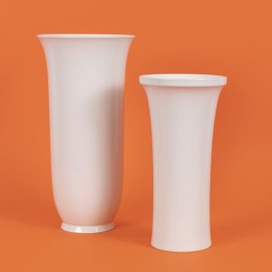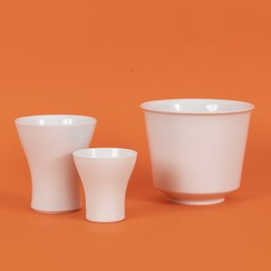 White porcelain; cachepot from the “Urania” collection and two “Krokus” beakers or vases of different sizes; height: approx. 8, 11.5 and 12.5 cm; 1st quality and in very good condition with minimal signs of use (cachepot with tiny, inconspicuous “tinz chip” on the foot ring); underside with various earlier underglaze blue sceptre marks; total weight: approx. 870 g.