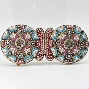 Brass mount; two-part construction; round and slightly curved forms; front divided into individual segments and inlaid with polychrome glass micromosaics in a Millefiori pattern of stars, leaves and flowers; diameter: each approx. 41 mm; total length: approx. 9.7 cm.