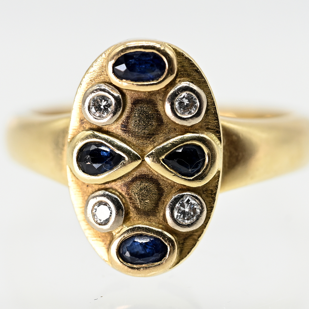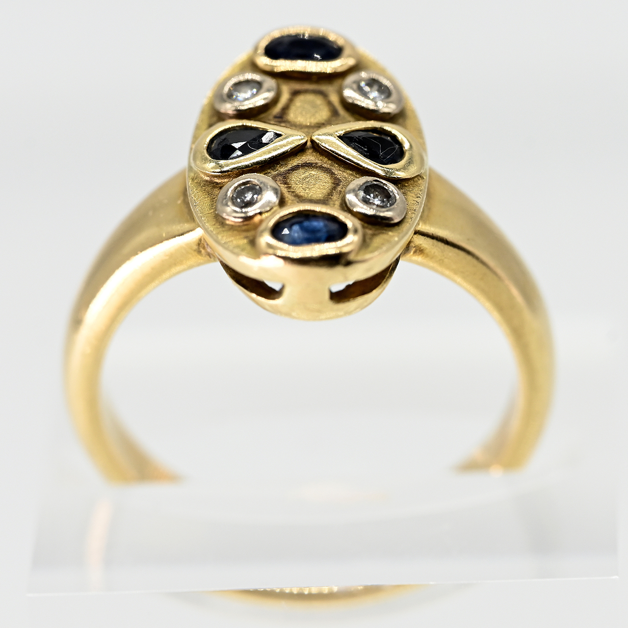 585/- Gelb- und Weißgold; Gesamtgewicht: ca. 6,9 g; hochovale Ringmitte mit einzelnen runden, tropfenförmigen und ovalen Zargenfassungen; ausgefasst mit 4 Saphiren und 4 Brillanten, zus. ca. 0,12 ct; Farbe und Reinheit: im mittleren Bereich; Maße der Ringmitte: ca. 15,2 x 9,8 mm; Höhe: ca. 4,2 mm; Ringgröße: 55,5.