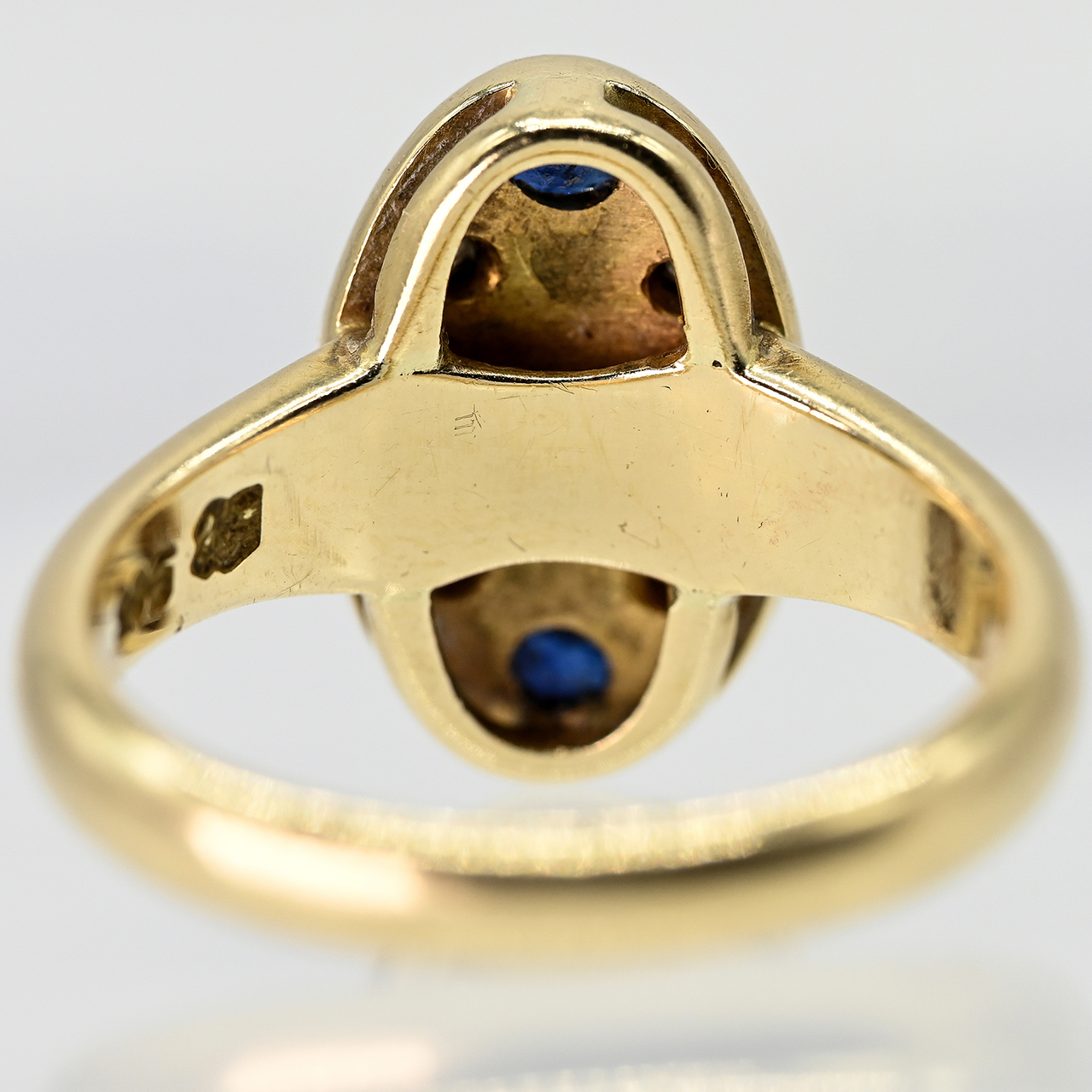 585/- yellow and white gold; total weight: approx. 6.9 g; high-oval ring centre with individual round, drop-shaped and oval bezel settings; set with 4 sapphires and 4 brilliant-cut diamonds, total approx. 0.12 ct; colour and clarity: mid-range; dimensions of ring centre: approx. 15.2 x 9.8 mm; height: approx. 4.2 mm; ring size: 55.5.