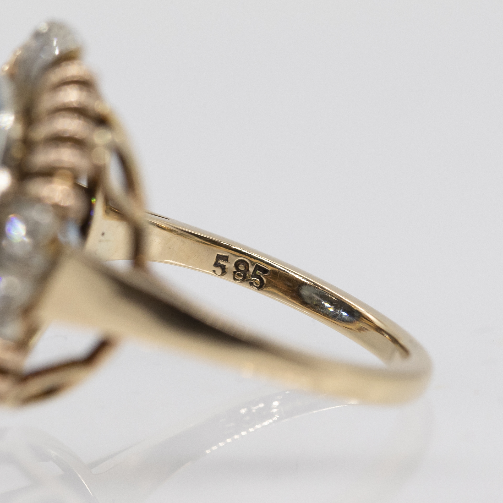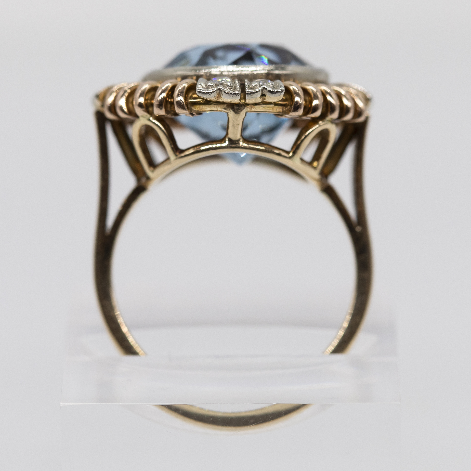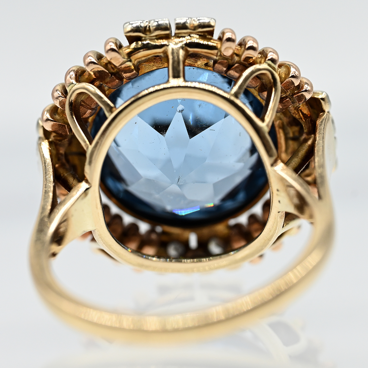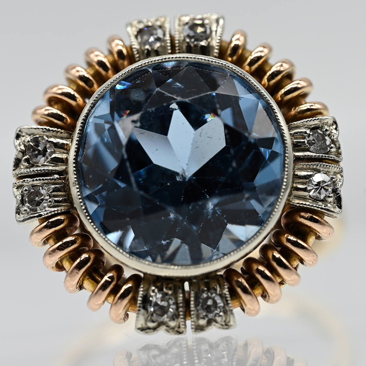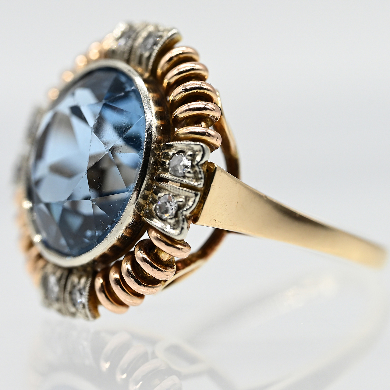 585/- Gelb- und Weißgold; Gesamtgewicht: ca. 10 g; zentral gefasster runder, facettierter blauer Farbstein; umrahmt von spiralförmigem Fassungsrand, dieser unterteilt von vier, zweifach gegliederten, weißgoldenen Feldern mit Millgriffrändern; jeweils mit zwei kleinen Diamanten besetzt, zus. ca. 0,16 ct; Farbe und Reinheit: im mittleren Bereich; konisch verlaufende Ringschiene; Durchmesser der Ringmitte: ca. 21,6 mm, Höhe: 9,1 mm; Ringgröße: 56,5. Farbstein mit minimalen Tragespuren an den Facettenkanten.