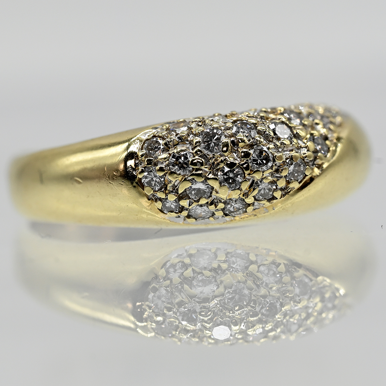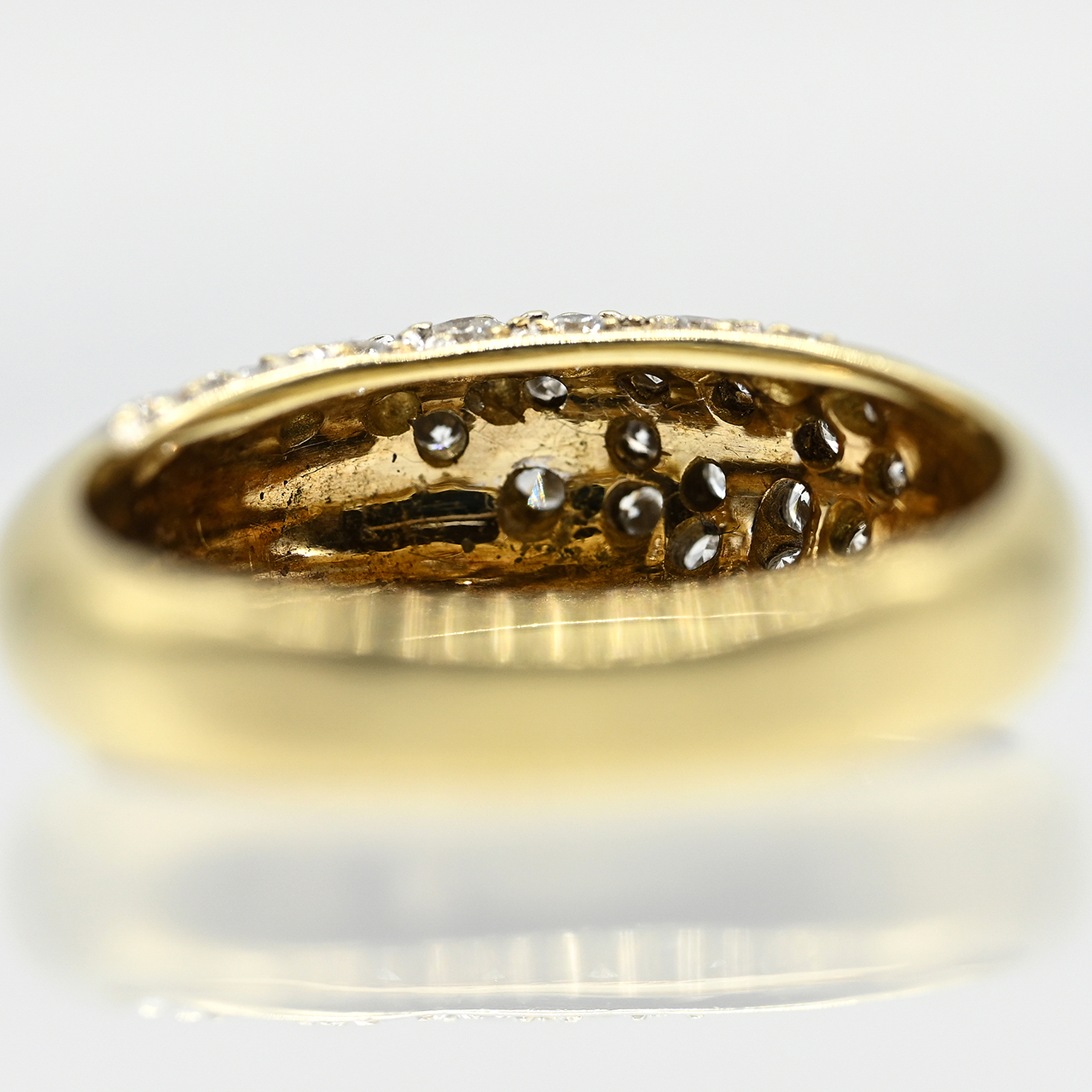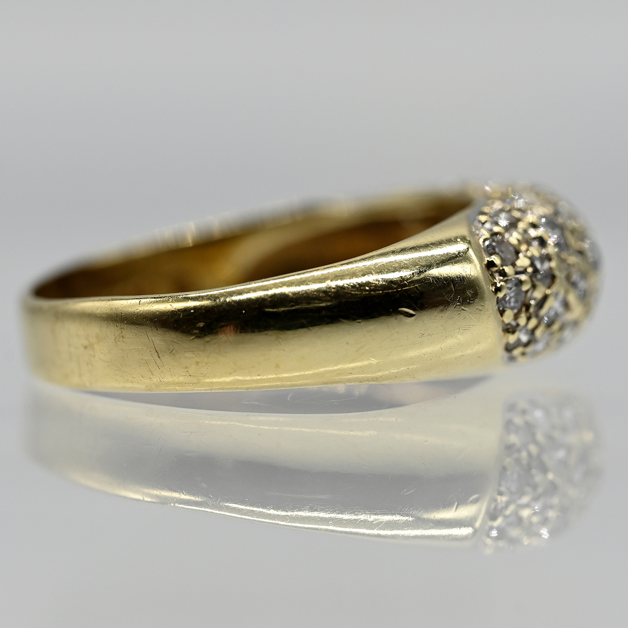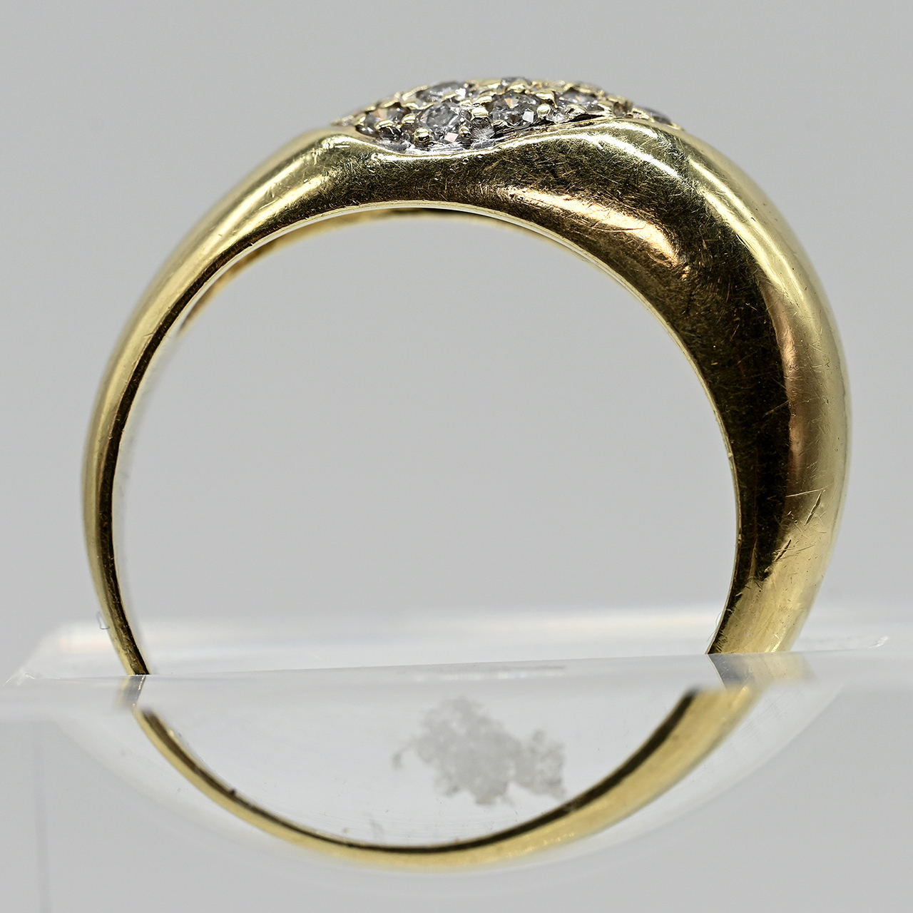 585/- Gelbgold; Gesamtgewicht: ca. 4,5 g; stilisierte Bandringform mit diagonalem, breitem Streifen; ausgefasst mit 25 Diamanten, zus. ca. 0,3 ct (lt. Ritzgravur); Farbe: G-J; Reinheit: VSI-SI; Maße der Ringmitte: Breite ca. 6,4 mm; Höhe: ca. 4,6 mm; Ringgröße: 52.