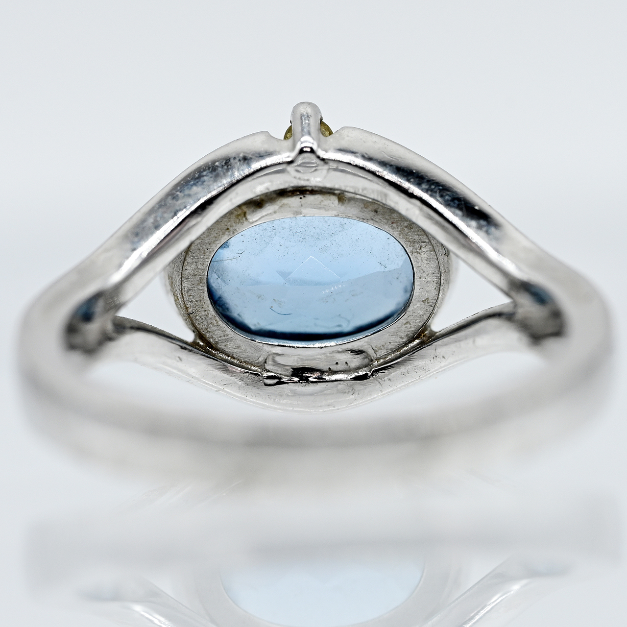 585/- white gold; total weight: approx. 5.9 g; square shank with split ring head; set with a cross-oval bezel setting and a small chaton setting, each holding an oval faceted light blue topaz; dimensions: approx. 7 x 9.5 mm; on the side, one small single-cut diamond in fancy yellow colour variety; dimensions of ring head: approx. 11.1 x 16 mm; ring size: 53.5.