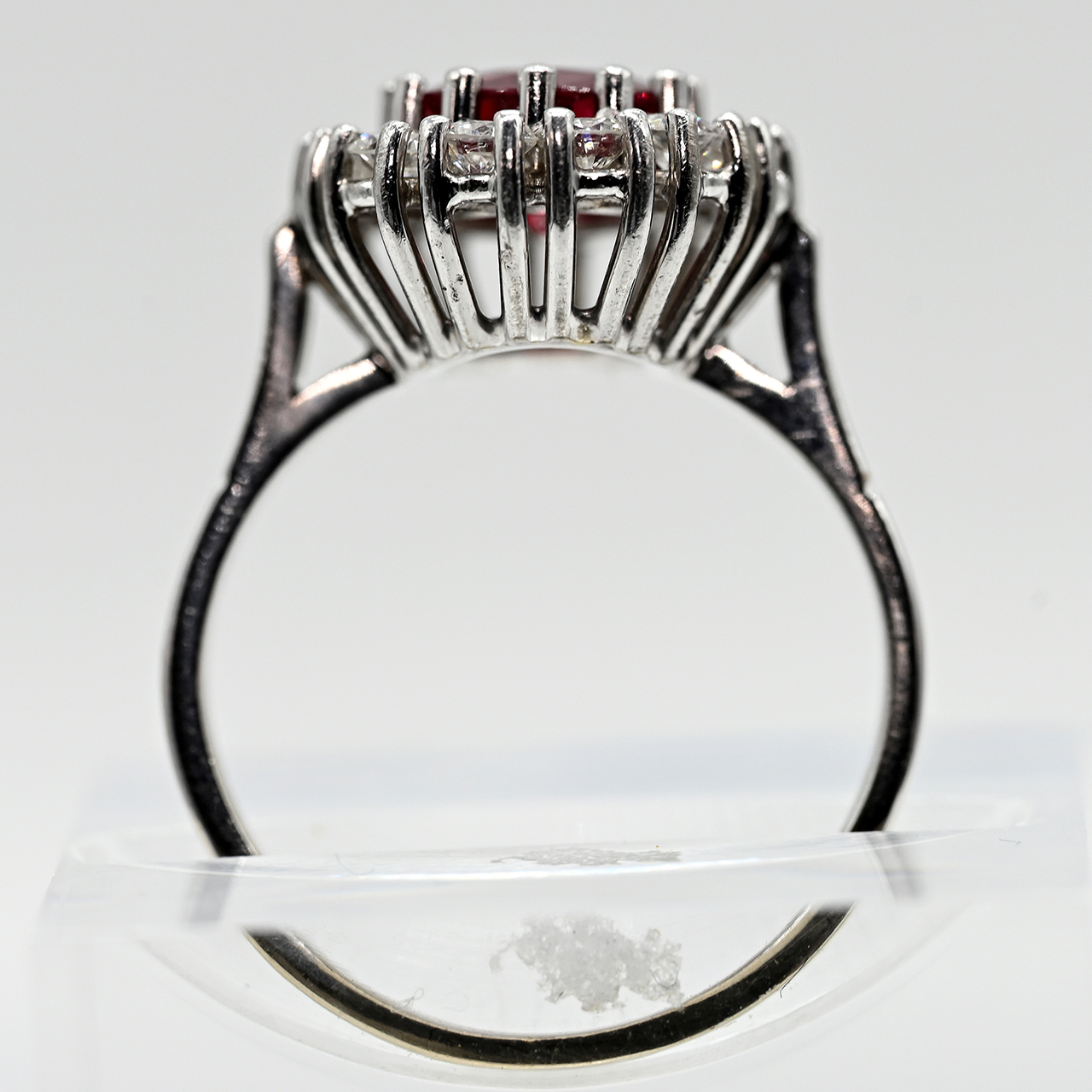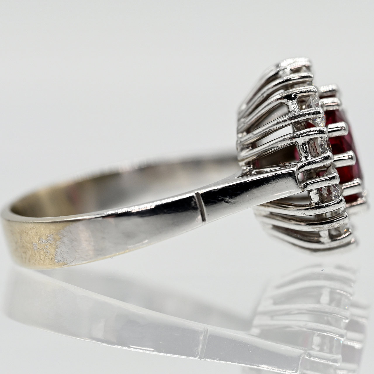 585/- white gold; total weight: approx. 4.7 g; raised, stepped claw setting; centre set with ruby, approx. 1.4 ct (approx. 7.2 x 6.5 x 3.9 mm); surrounded by 12 brilliant-cut diamonds, total approx. 0.5 ct; colour: F-G; clarity: VSI-SI; plain tongue-shaped shank; dimensions of ring centre: approx. 12.9 x 12.3 mm; ring size: 50; fine hairline crack in the ruby, starting from a facet edge at 4 o’clock towards the beginning of the table.