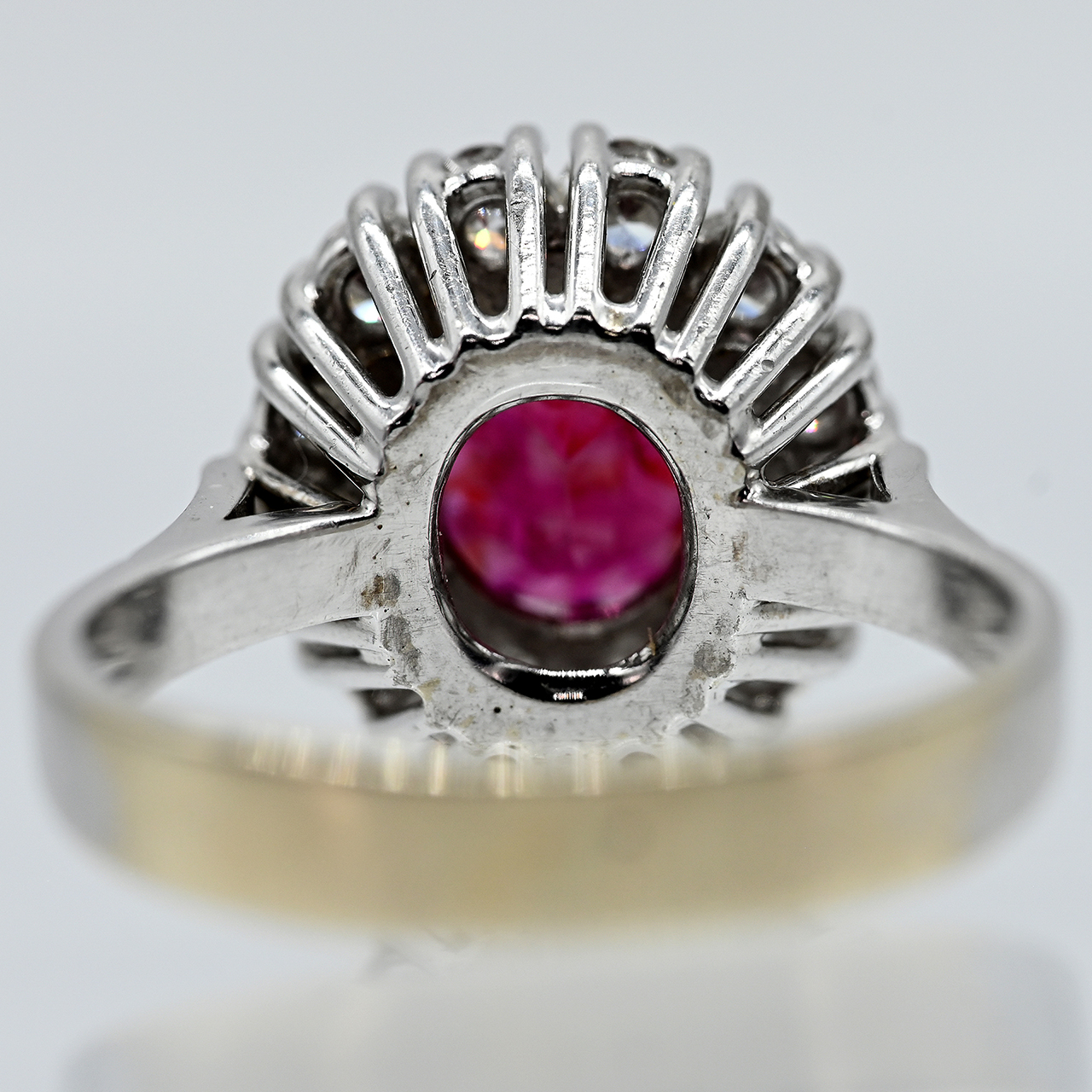 585/- Weißgold; Gesamtgewicht: ca. 4,7 g; erhöhte, getreppte Krappenfassung; mittig gefasster Rubin, ca. 1,4 ct (ca. 7,2 x 6,5 x 3,9 mm); umrahmt von 12 Brillanten, zus. ca. 0,5 ct; Farbe: F-G; Reinheit: VSI-SI; schlichte Zungenschiene; Maße der Ringmitte: ca. 12,9 x 12,3 mm; Ringgröße: 50; feiner Haarriss im Rubin, von einer Facettenkante beginnend auf der 4 bis zum Anfang der Tafel.