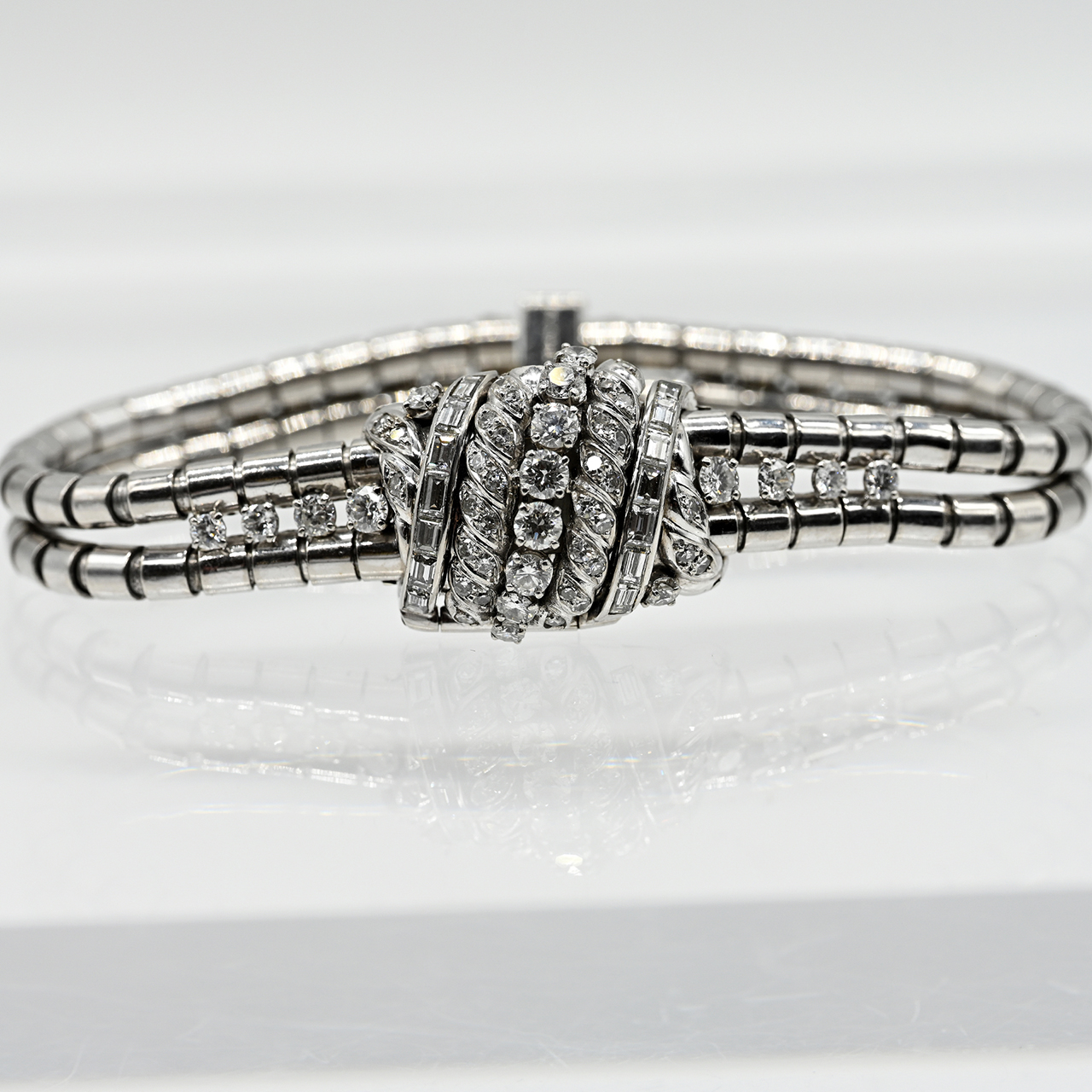 Schmuckarmbanduhr mit 51 Brillanten und 14 Diamant-Baguettes, zus. ca. 3 ct, bezeichnet Gübelin, 50er Jahre