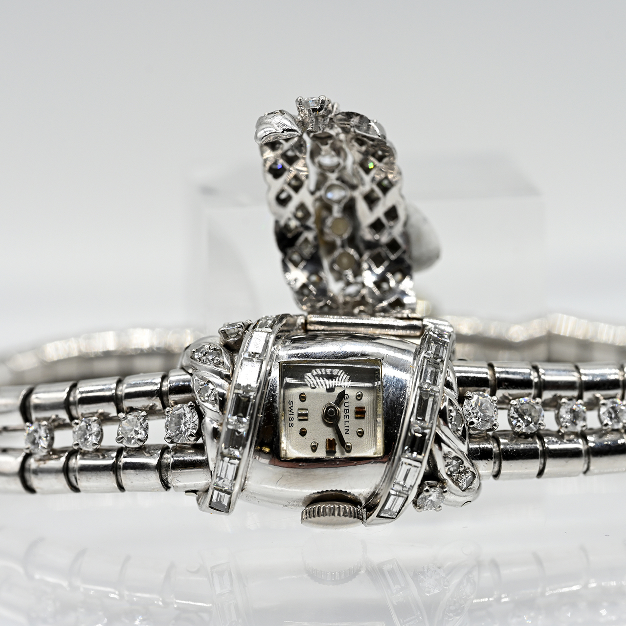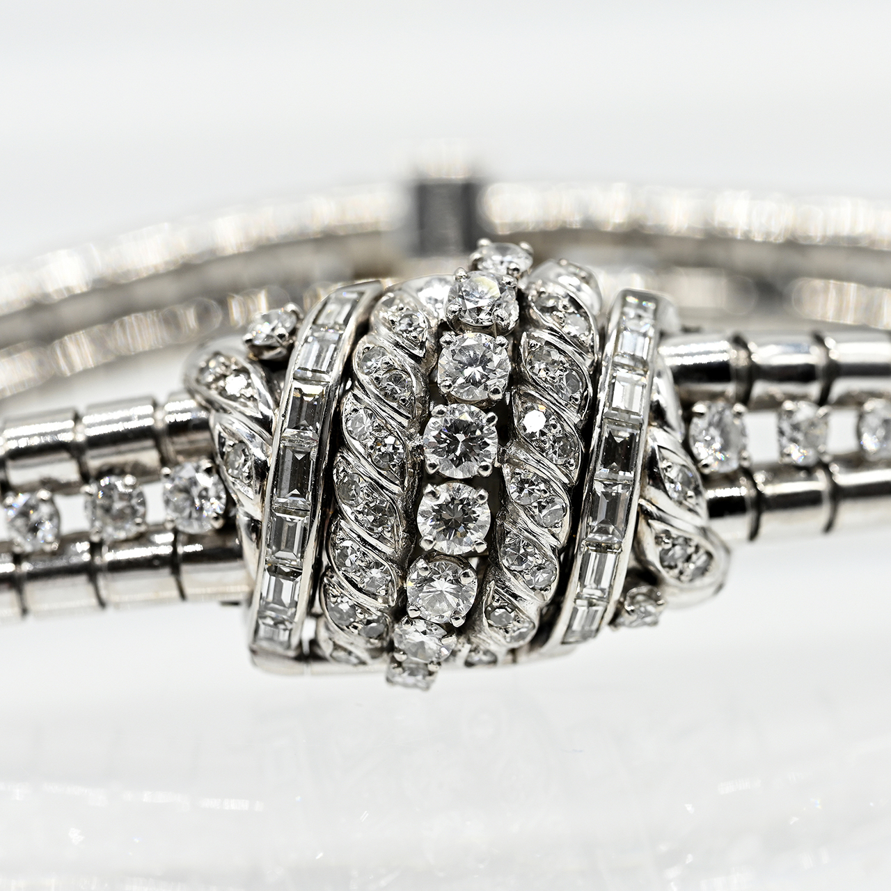 Jewellery wristwatch with 51 brilliant-cut diamonds and 14 baguette-cut diamonds, total approx. 3 ct, signed Gübelin, 1950s