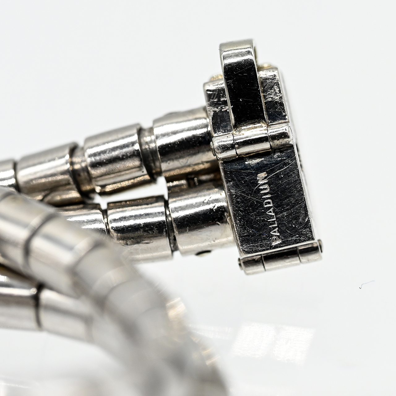 Platin; Gesamtgewicht: ca. 50,3 g; Mittelteil in stilisierter Knotenform am Ansatzanfang, reichhaltig verziert mit 51 Brillanten und 14 Diamanten im Baguette-Schliff, zus. ca. 3 ct; Farbe: G-H; Reinheit: VVS-VS; aufklappbarer Deckel mit darunterliegendem quadratischem Zifferblatt, Strichindex und linearen Zeigern; doppelreihiges Ansatzband aus einzelnen, aneinandergesetzten, tonnenförmigen Gliedern; Sicherheitsklappschließe; Maße der Uhrenmitte: ca. 20 x 51,3 mm; Höhe: ca. 10,3 mm; Gesamtlänge: ca. 19,5 cm; keine Garantie auf Werk und Funktion.