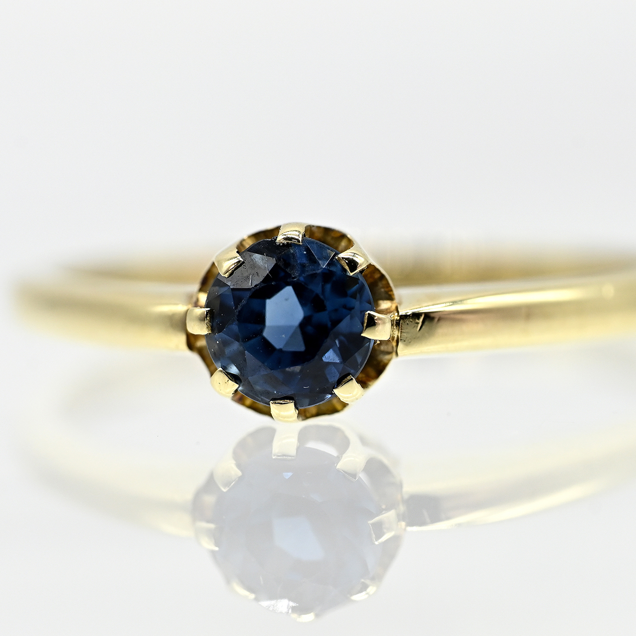 585/- yellow gold; total weight: approx. 2.6 g; coronet setting and simple tongue shank; set with a blue faceted gemstone; diameter: approx. 4.5 mm; facet edge and girdle of the stone showing visible signs of wear; dimensions of ring head: diameter: approx. 5.6 mm; height: approx. 5 mm; ring size: 56.
