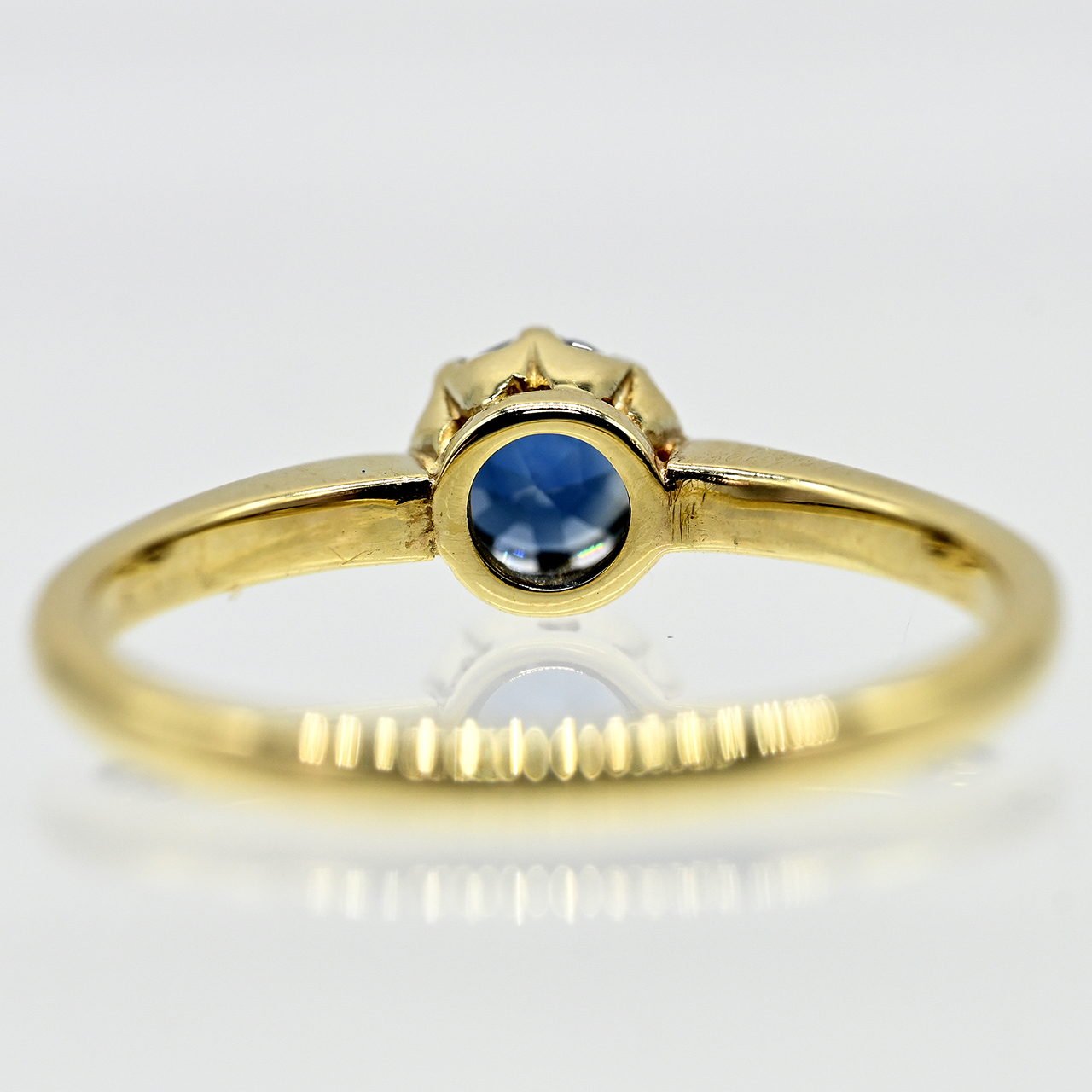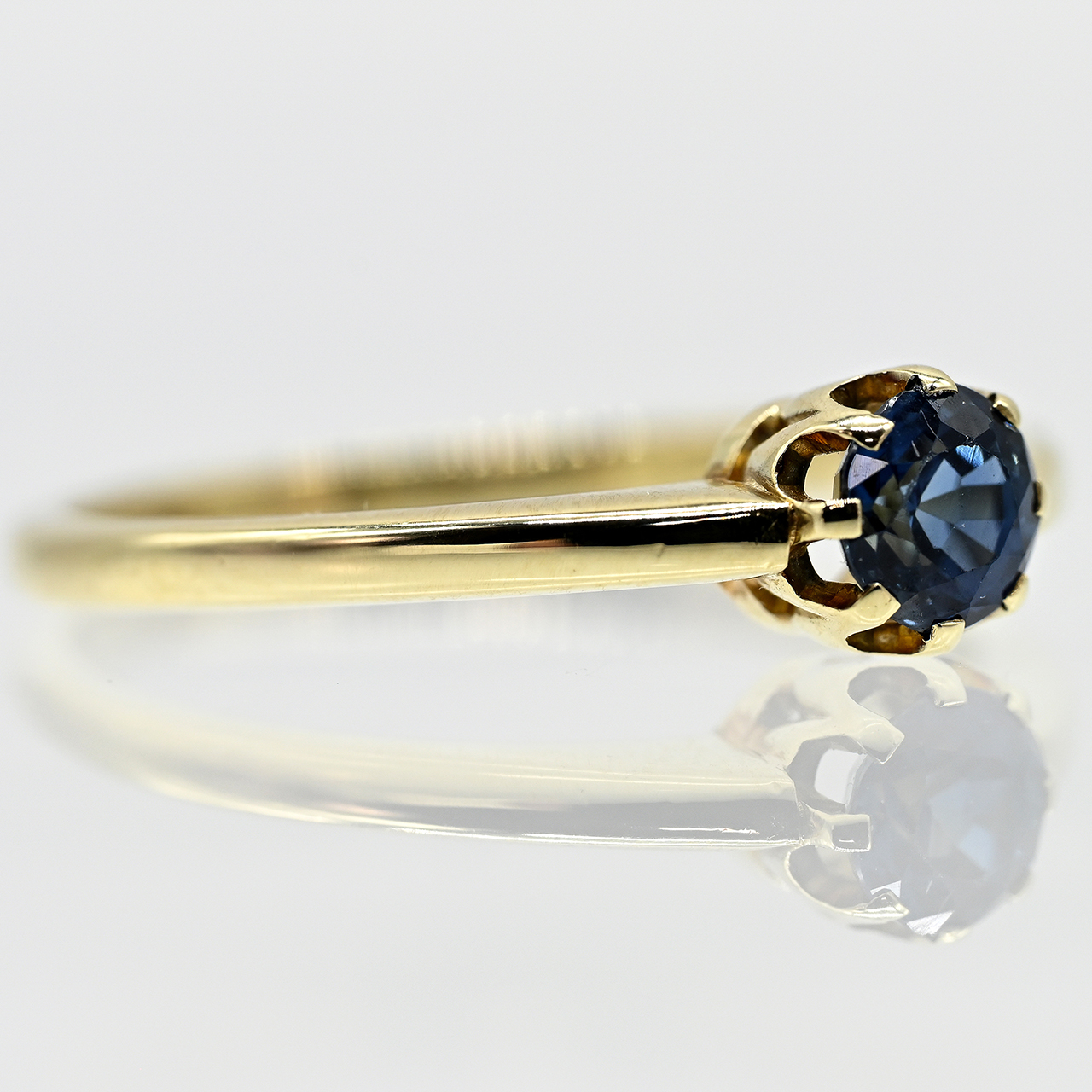 585/- Gelbgold; Gesamtgewicht: ca. 2,6 g; Krönchenfassung und schlichte Zungenschiene; gefasster blauer, facettierter Farbstein; Durchmesser: ca. 4,5 mm; Facettenkante und Rondiste des Steines mit sichtbaren Tragespuren; Maße der Ringmitte: Durchmesser: ca. 5,6 mm, Höhe: ca. 5 mm; Ringgröße: 56.