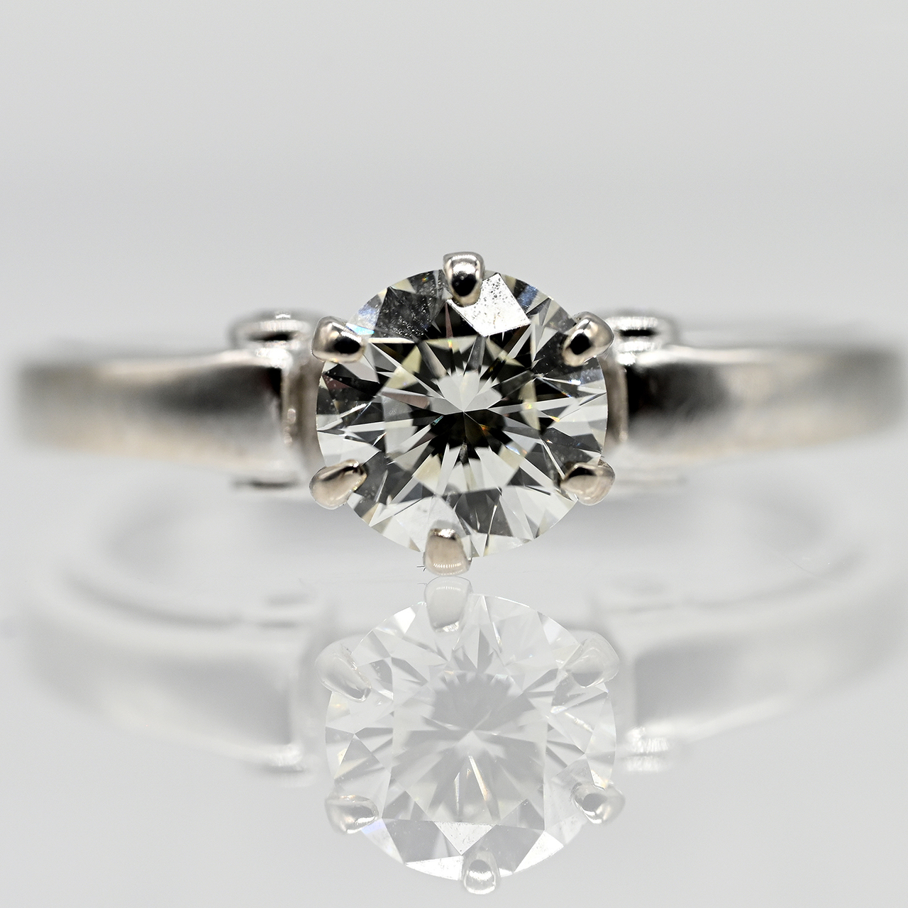 750/- Weißgold; Gesamtgewicht: ca. 4,3 g; 6-fache Krönchenfassung; gefasster Brillant, 1 ct, mit HRD-Gutachten von 2007; Farbe: J; Reinheit: VS1; Maße des Steins: 6,41-6,45 mm x 4,00 mm; alle aufgeführten Angaben lt. Zertifikat, weitere detaillierte Untersuchungsergebnisse in den Unterlagen; seitlich offene Zungenschiene; dazwischen im oberen Teil eingesetzte kleine Scharniere mit zus. 4 gefassten Achtkantdiamanten; Fassungsdurchmesser: ca. 7,1 mm; Höhe: ca. 7,4 mm; Ringgröße: 53.