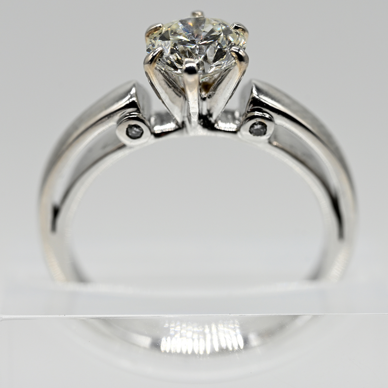 750/- white gold; total weight: approx. 4.3 g; six-prong coronet setting; set with a brilliant-cut diamond, 1 ct, accompanied by HRD certificate from 2007; colour: J; clarity: VS1; stone dimensions: 6.41-6.45 mm x 4.00 mm; all specifications according to the certificate, further detailed examination results available in the documentation; laterally open tongue band; in the upper section, small hinges with a total of 4 single-cut diamonds; setting diameter: approx. 7.1 mm; height: approx. 7.4 mm; ring size: 53.