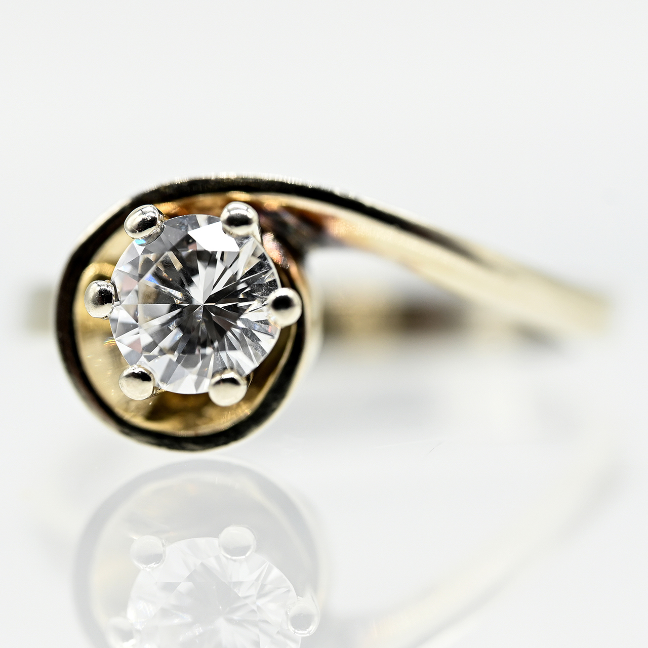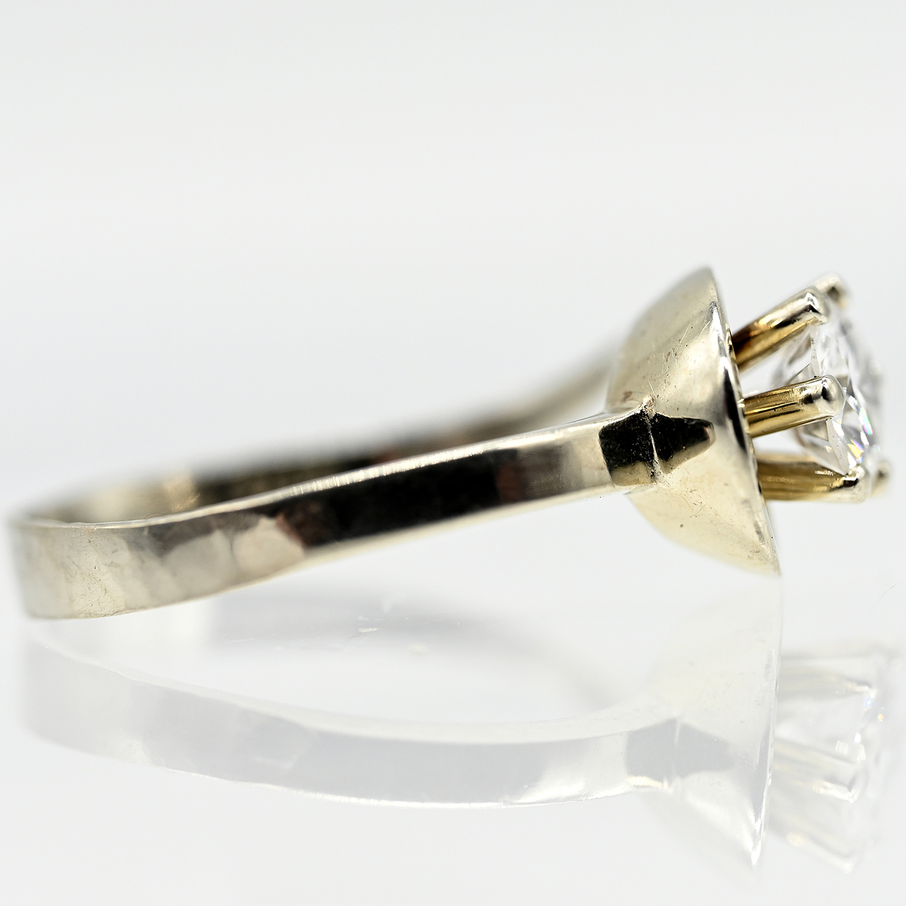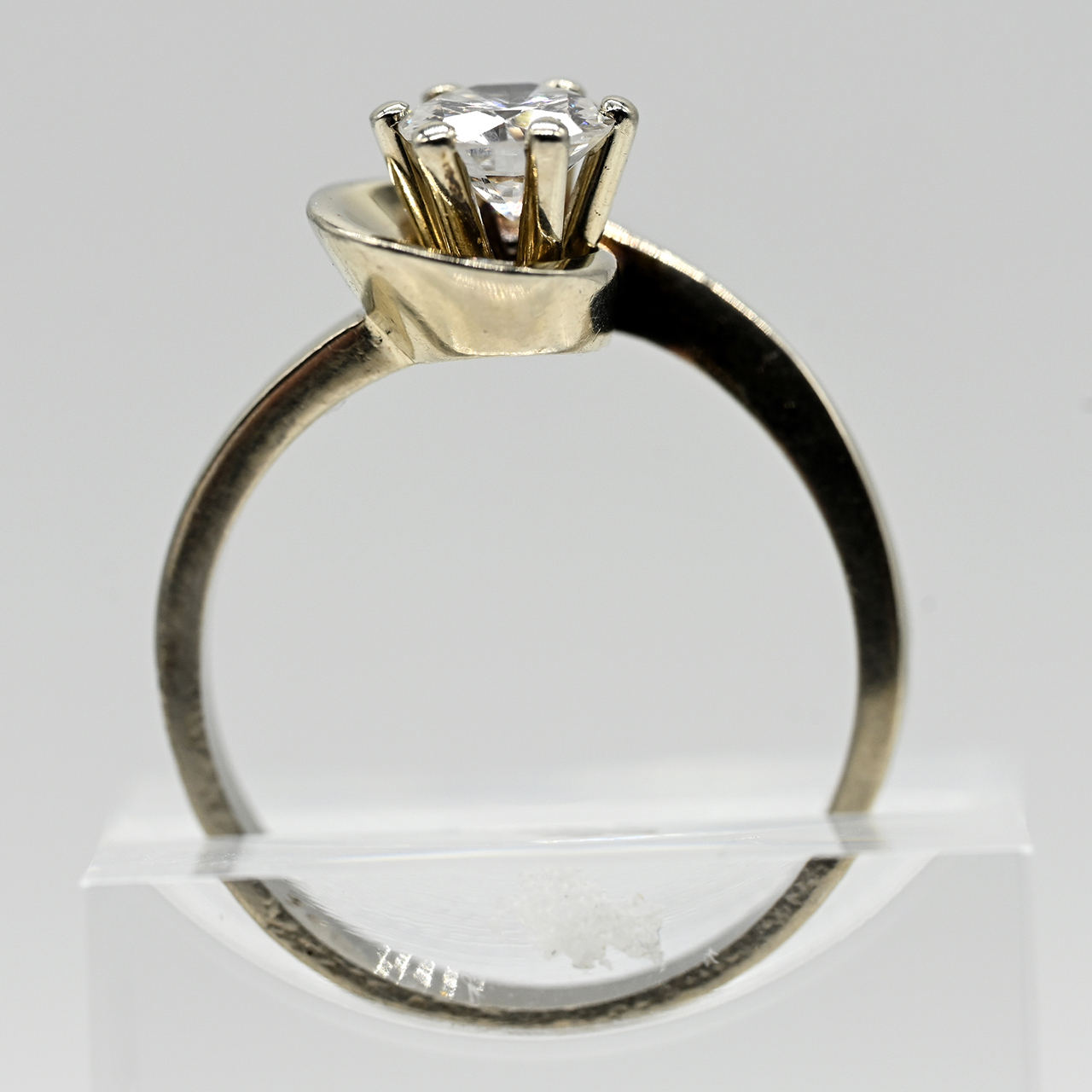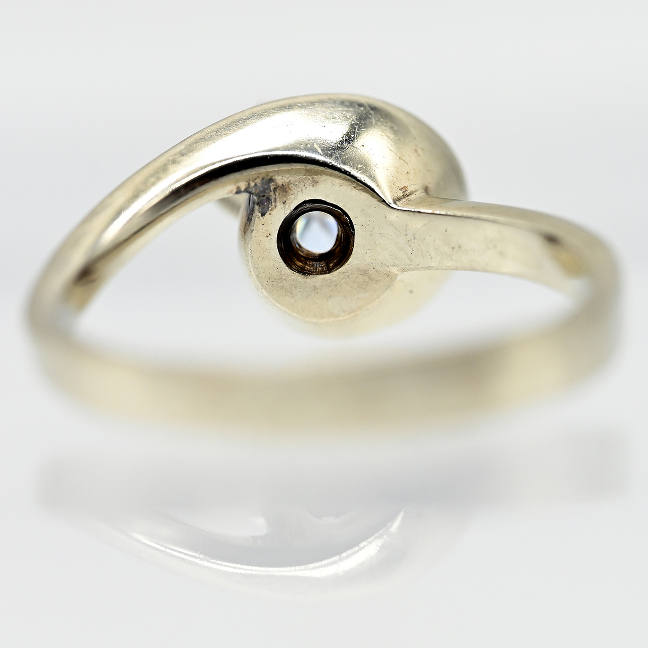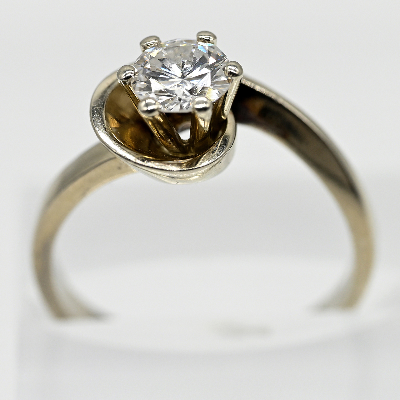 750/- Weißgold; Gesamtgewicht: ca. 4 g; schneckenförmig gedrehte Ringmitte; eingesetzte Krappenfassung mit gefasstem Brillanten ca. 0,6(7) ct; Farbe: G-H; Reinheit: SI 1; Maße der Ringmitte: ca. 9 x 8,3 mm, Höhe: ca. 6,7 mm; Ringgröße: 55; Ring mit deutlichen Tragespuren, Pfeilstrichen und Hammerfläche in dem unteren Ringschienenbereich, wohl durch eine nicht fachmännische Ringerweiterung.