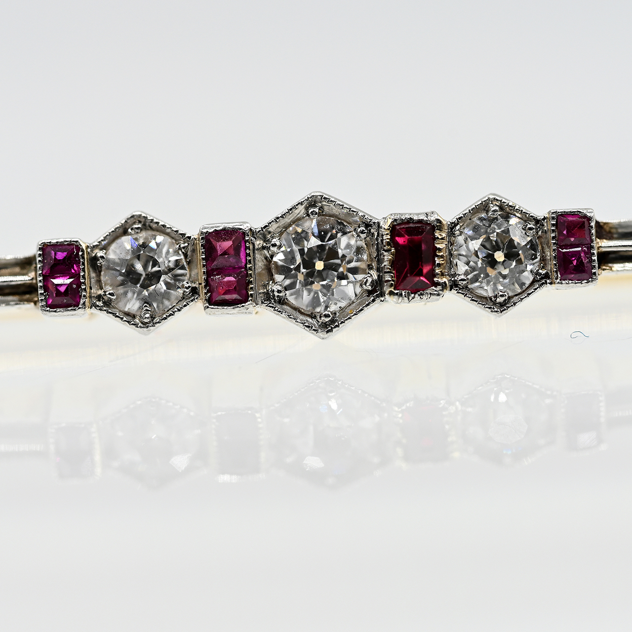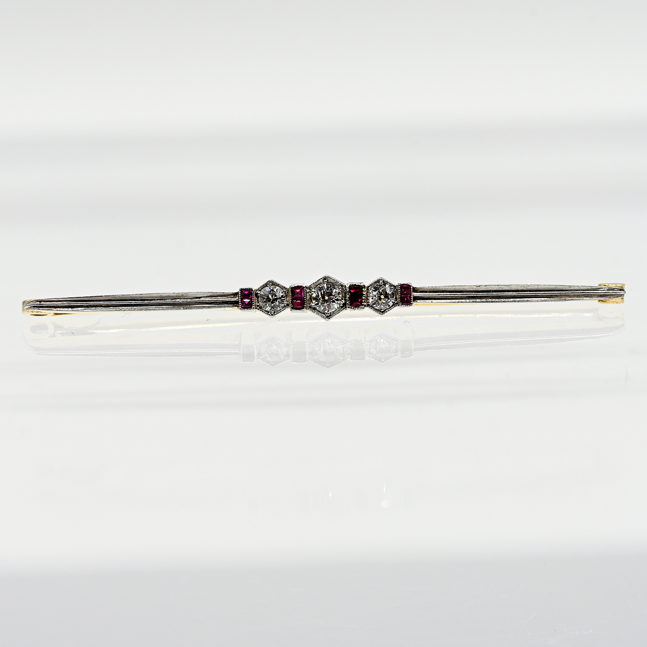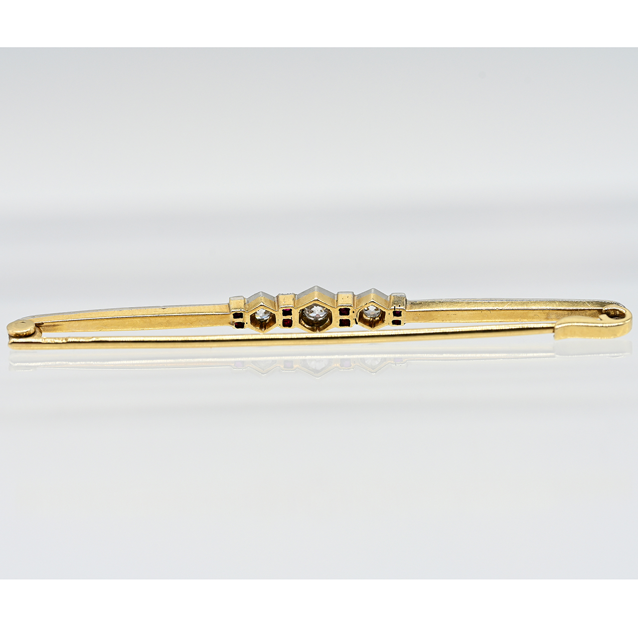 750/- yellow and white gold; total weight: approx. 4.3 g; double-profiled square bar; centre with 3 rhombic settings, each set with 1 brilliant-cut diamond, total approx. 0.2 ct; colour: H-J; clarity: SI 1-2; divided by 4 vertical segments, 3 each set with 2 small ruby carrés and 1 with a red gemstone; dimensions of pin centre: approx. 4.5 x 17.1 mm; height: approx. 2.8 mm; total length: approx. 60.5 mm.