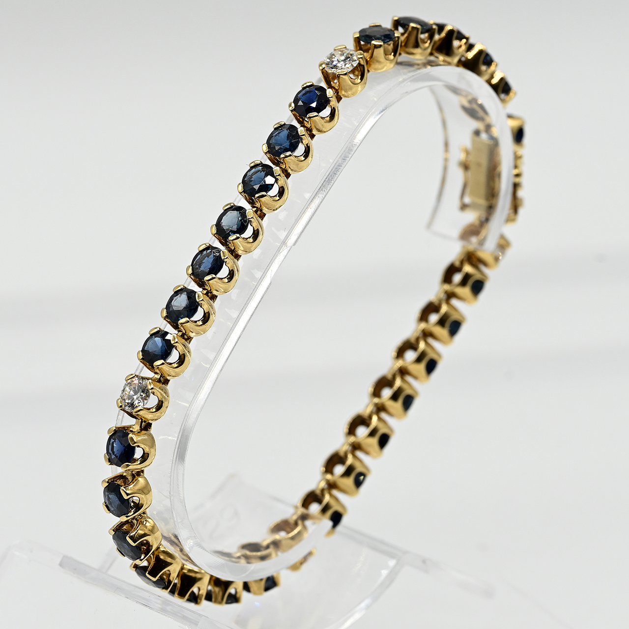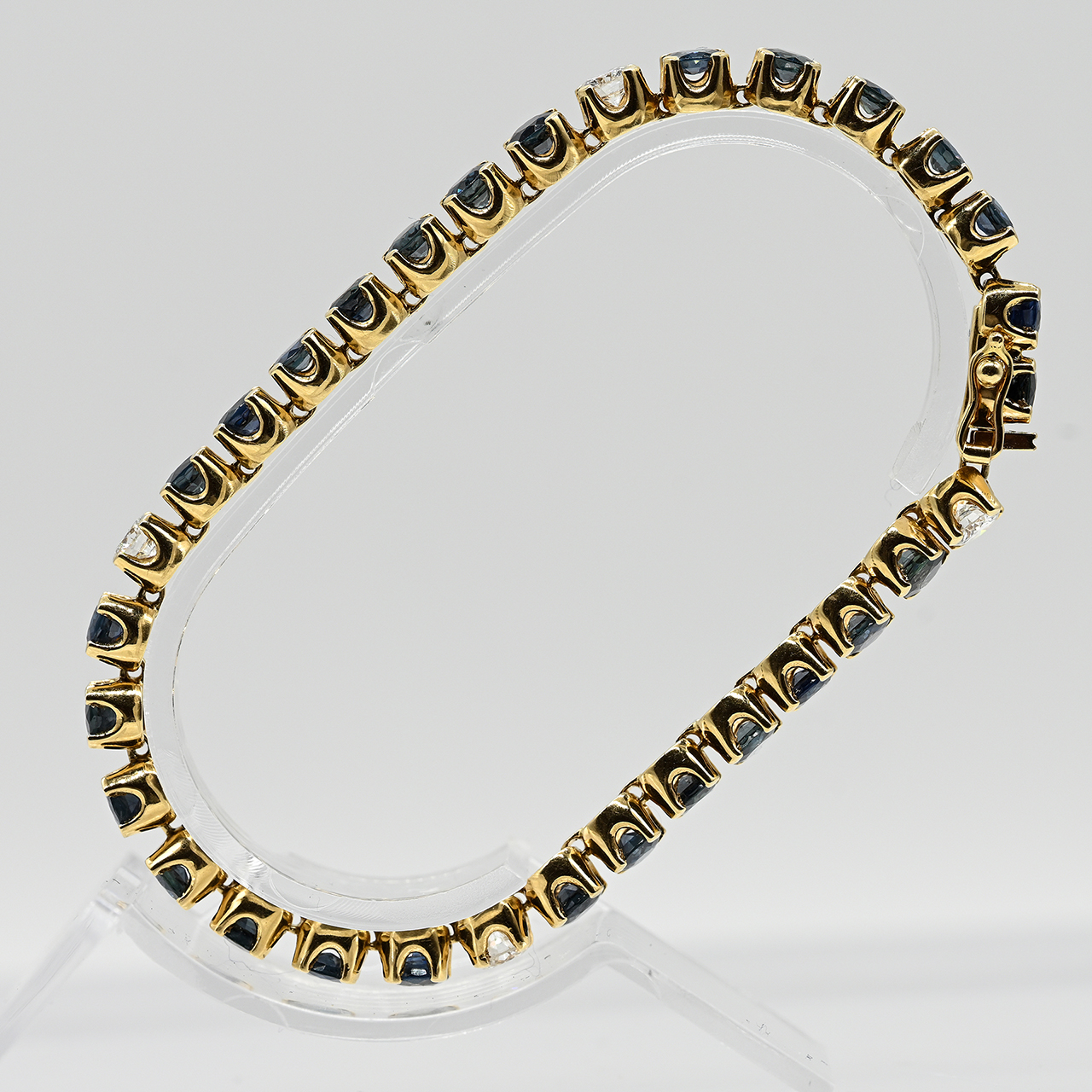 750/- Gelbgold; Gesamtgewicht: ca. 17 g; 33 einzelne, bewegliche Fassungen mit jeweils vier Krappen; ausgefasst mit 29 hochfeinen Saphiren, in regelmäßigem Abstand von vier Brillanten unterteilt, zus. ca. 1,16 ct (lt. Gravur); Farbe und Reinheit im oberen Bereich; verdecktes Kastenschloss mit seitlichen Sicherheitsachten; Maße des Armbands: ca. 5,1 mm; Gesamtlänge: ca. 18 cm.