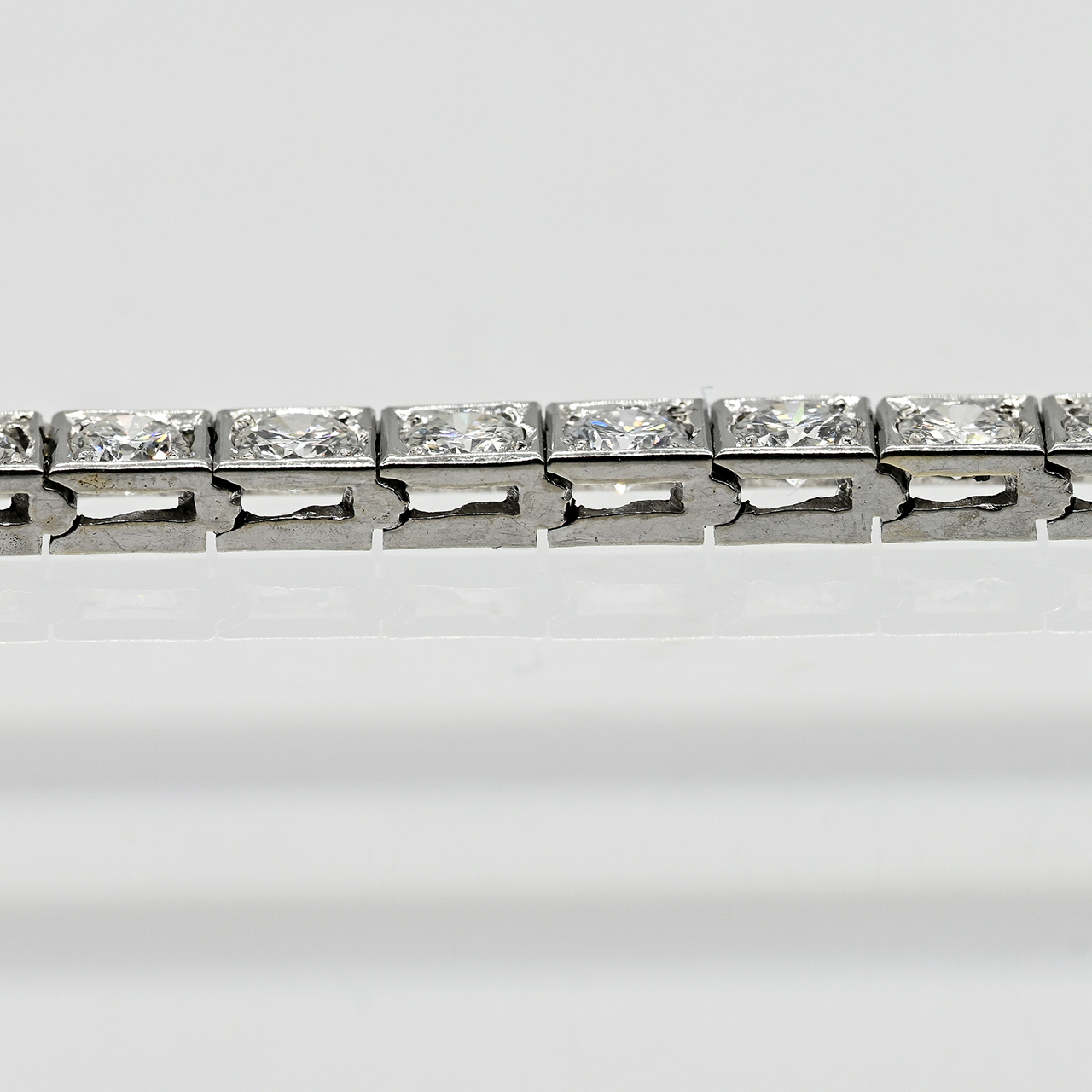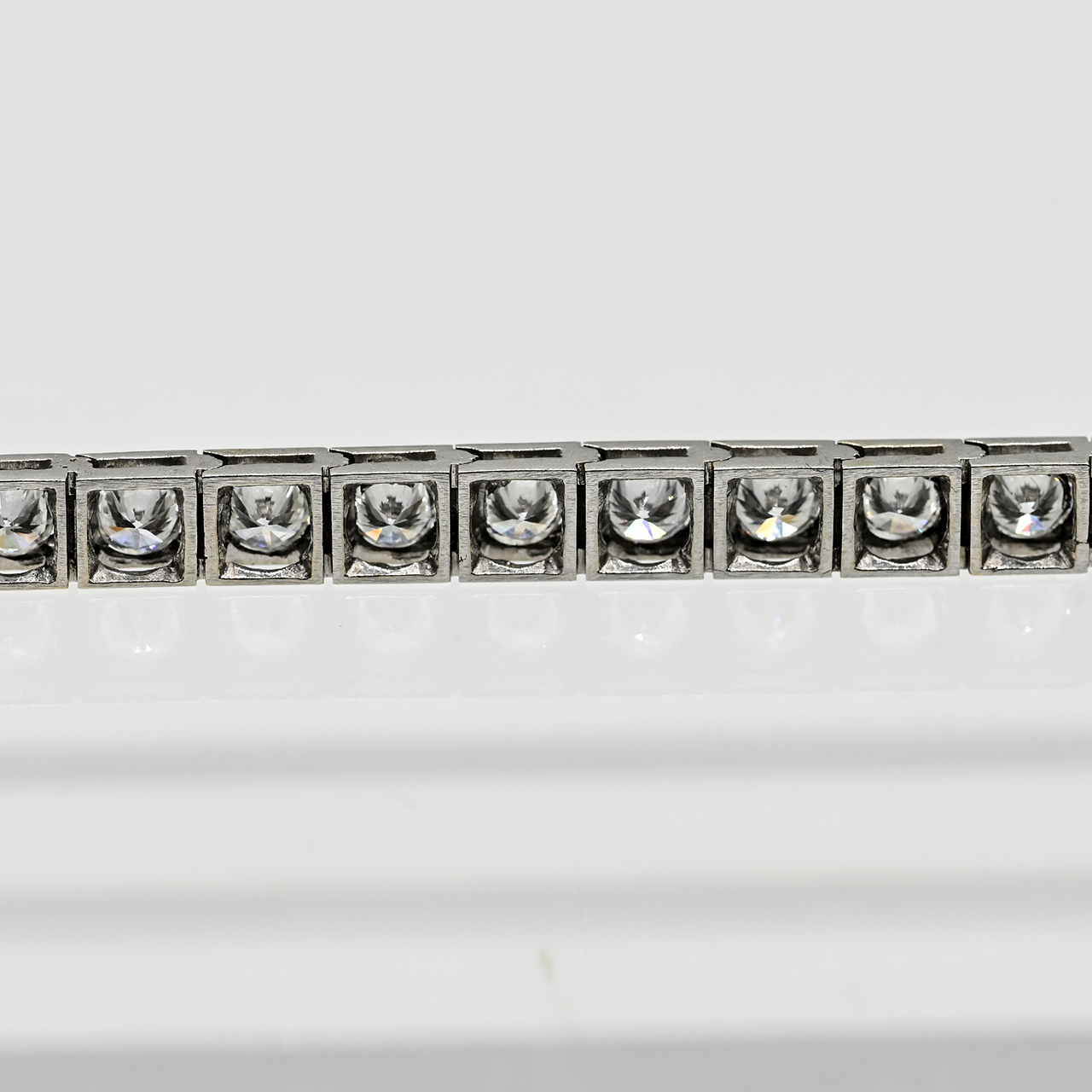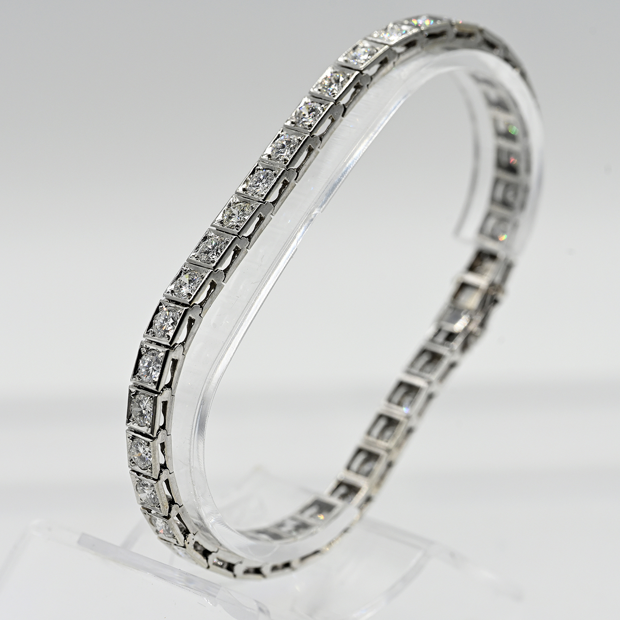 750/- Weißgold; Gesamtgewicht: ca. 16,1 g; einzelne, bewegliche Fassungen in quadratischer Form; jeweils mit 38 Brillanten aufgefasst, zusammen ca. 5,5 ct; Farbe: F-H; Reinheit: VVSI- VSI; verdecktes Kastenschloss mit seitlicher Sicherheitsacht; Breite des Armbandes: ca. 4,8 mm; Gesamtlänge: ca. 18,5 cm.