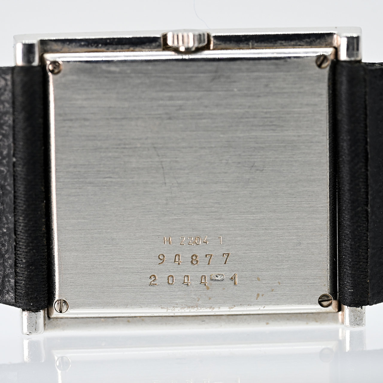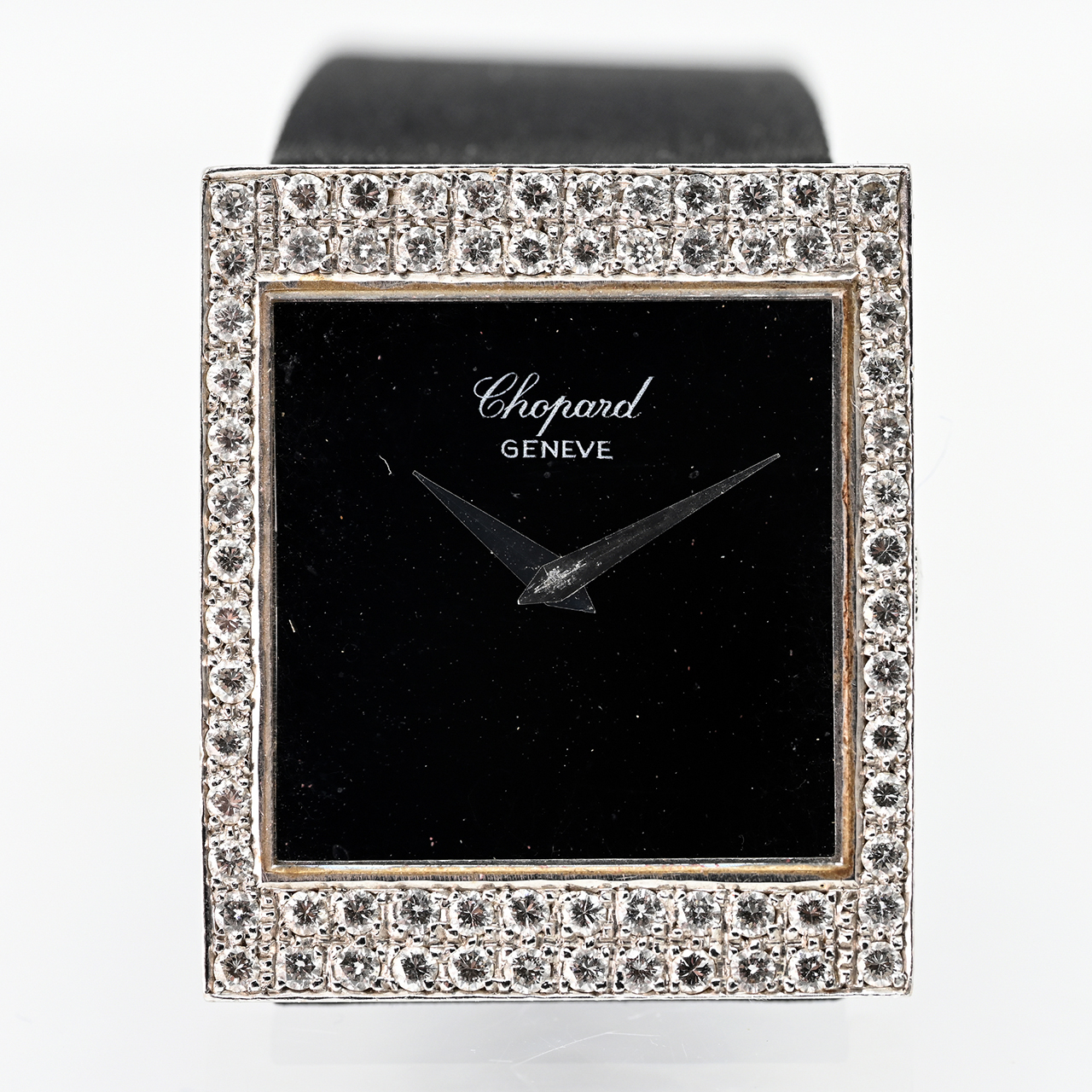 Gehäuse und Stiftschließe aus 18 kt (750/-) Weißgold; schwarzes Textilarmband; Gesamtgewicht: ca. 35,3 g; Handaufzugswerk, Kaliber Frédéric Piguet 21; Gehäuse in Rechteckform; quadratisches Zifferblatt aus schwarzem Onyx mit weißgoldfarbenen, pfeilförmigen Zeigern; Lünette mit ca. 68 Diamanten ausgefasst; Stiftschließe mit 31 Diamanten besetzt, zus. ca. 1,5 ct; Farbe und Reinheit im oberen Bereich; Seriennummer: 94877; Referenznummer: H 2204/1; Maße des Gehäuses: ca. 30,4 x 26,6 mm; Höhe: 5 mm; leichte Tragespuren; keine Garantie auf Werk und Funktion; Originaletui; keine Papiere.