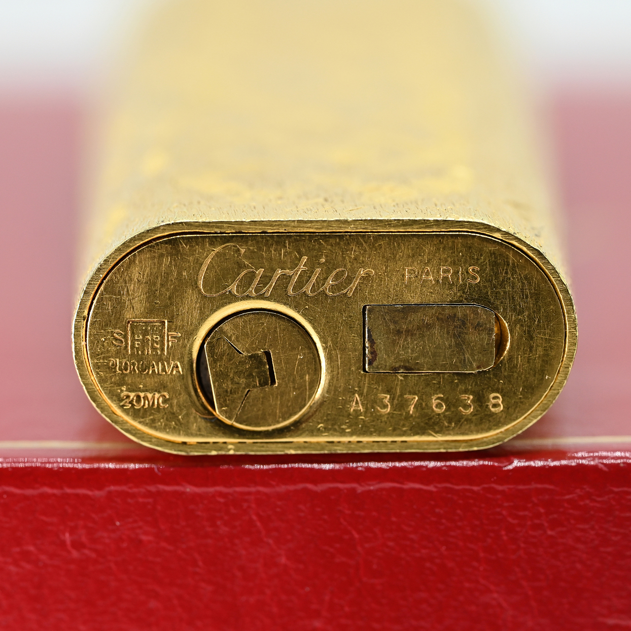 Goldfarben im Briquet Bark Design; Gas-Befüllung; am Boden signiert und bezeichnet; No. A37638; Original-Box; leichte Gebrauchsspuren; in Original-Box von Cartier; Höhe: ca. 7 cm.
