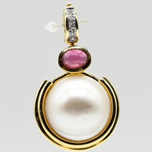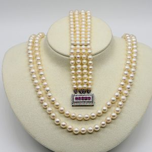 Akoya pearl necklace, double-strand, rosé-coloured with silvery-grey lustre and natural surface features; diameter: approx. 6-7 mm; yellow gold 585/- sliding clasp in barrel form; length: approx. 13.6 mm; diameter: approx. 6 mm; total necklace length: approx. 48 cm and 51 cm.