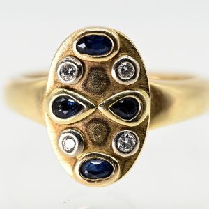 585/- yellow and white gold; total weight: approx. 6.9 g; high-oval ring centre with individual round, drop-shaped and oval bezel settings; set with 4 sapphires and 4 brilliant-cut diamonds, total approx. 0.12 ct; colour and clarity: mid-range; dimensions of ring centre: approx. 15.2 x 9.8 mm; height: approx. 4.2 mm; ring size: 55.5.