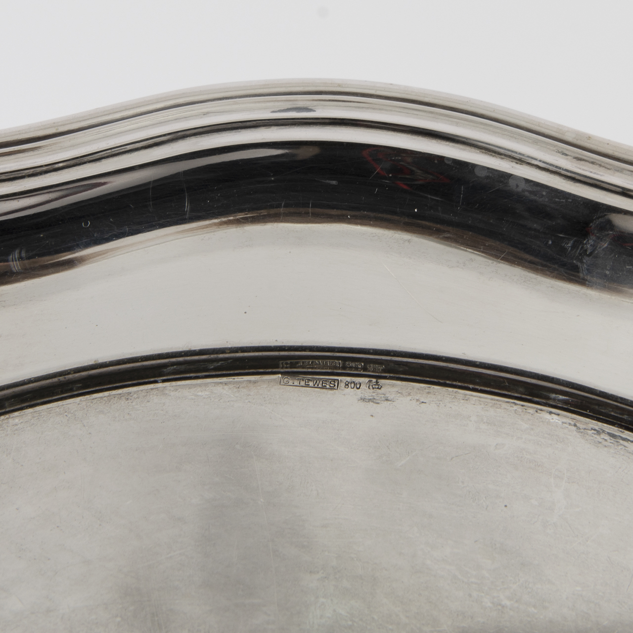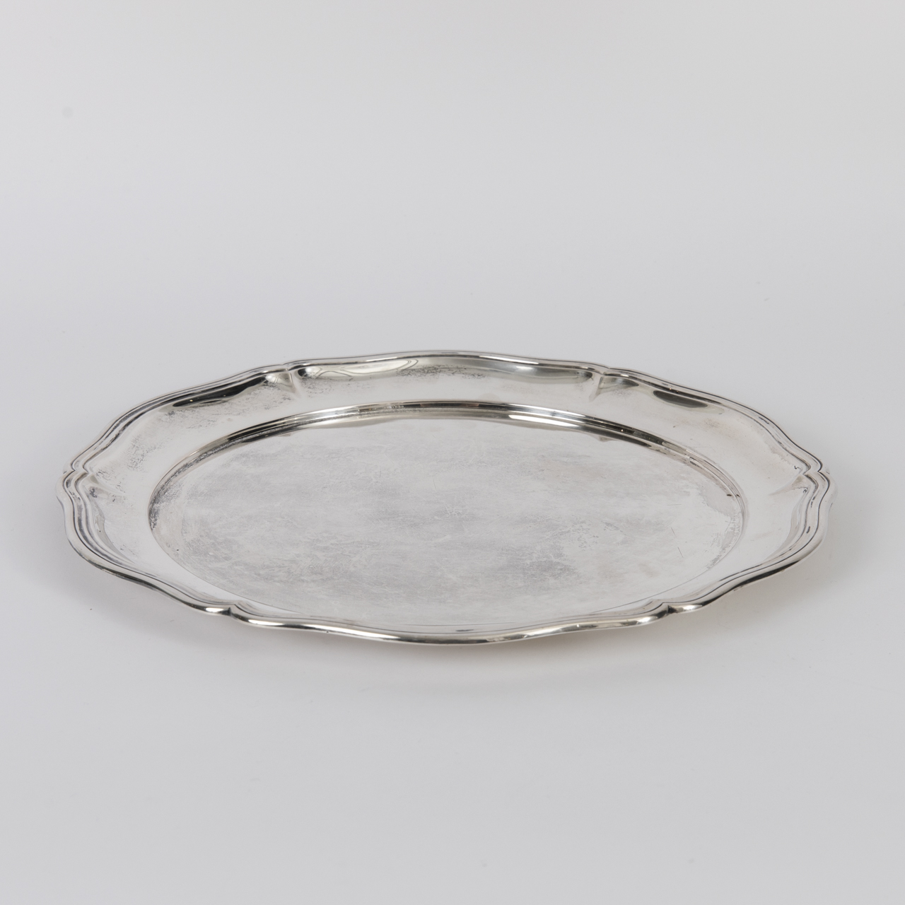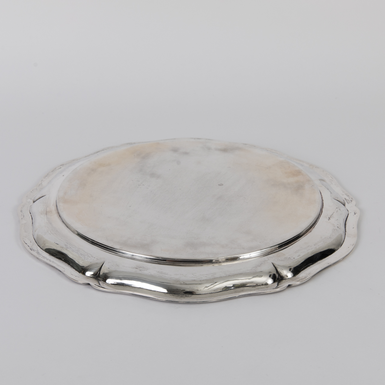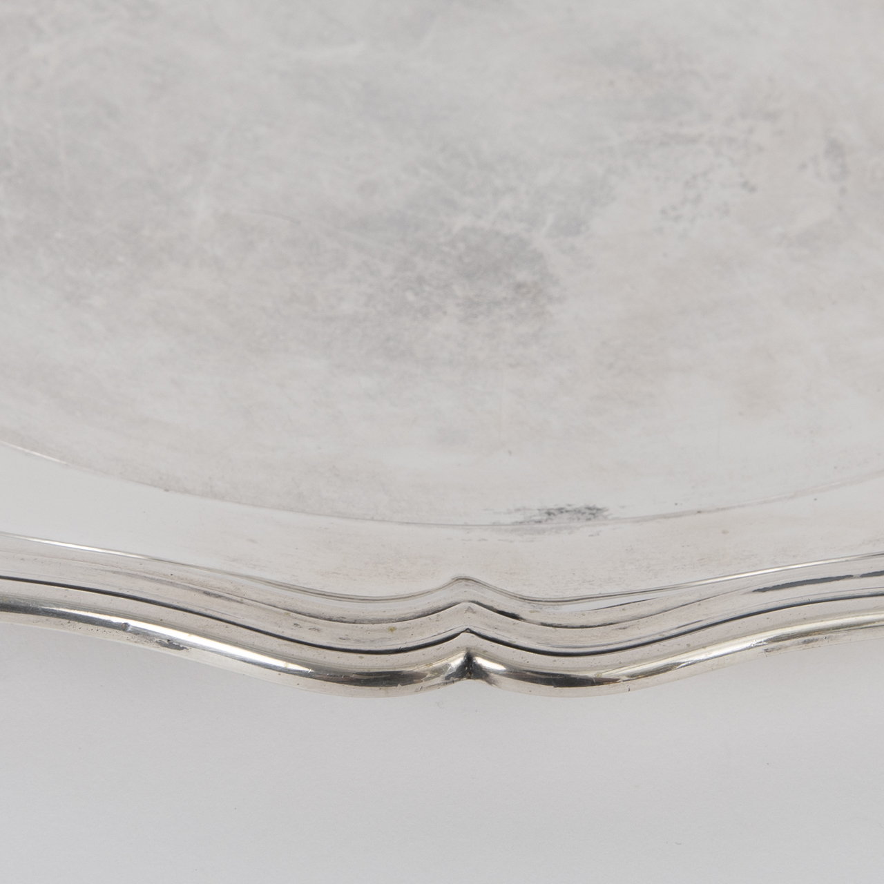 800/- silver: weight: approx. 690 g; round Chippendale serving tray with circular centre and slightly curved six-lobed rim; marked on the centre with crescent moon and crown, jeweller’s mark and fineness mark; age-related signs of wear and oxidation residues; diameter: approx. 34.7 cm.