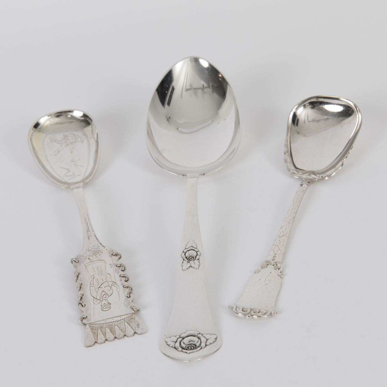Silver alloy; total weight: ca. 164 g; three-piece lot of spoons comprising: 1) serving spoon with trapezoid bowl with ornamental décor and widening handle with hammered decoration; reverse of handle with two obliterated marks; length: ca. 19 cm. 2) serving spoon with finely chased bowl depicting a hunter and livestock, and broad handle with depiction of a person, framed at the sides by fine rings and ending geometrically at the top; reverse of handle stamped with Swedish marks incl. date letter 1953; length: ca. 21 cm. 3) dumpling spoon with raised rose décor on handle and grip; reverse of handle stamped with Copenhagen city mark and assay year (19)22 as well as assay master’s mark of Christian F. Heise; length: ca. 25 cm. Age-related signs of wear.