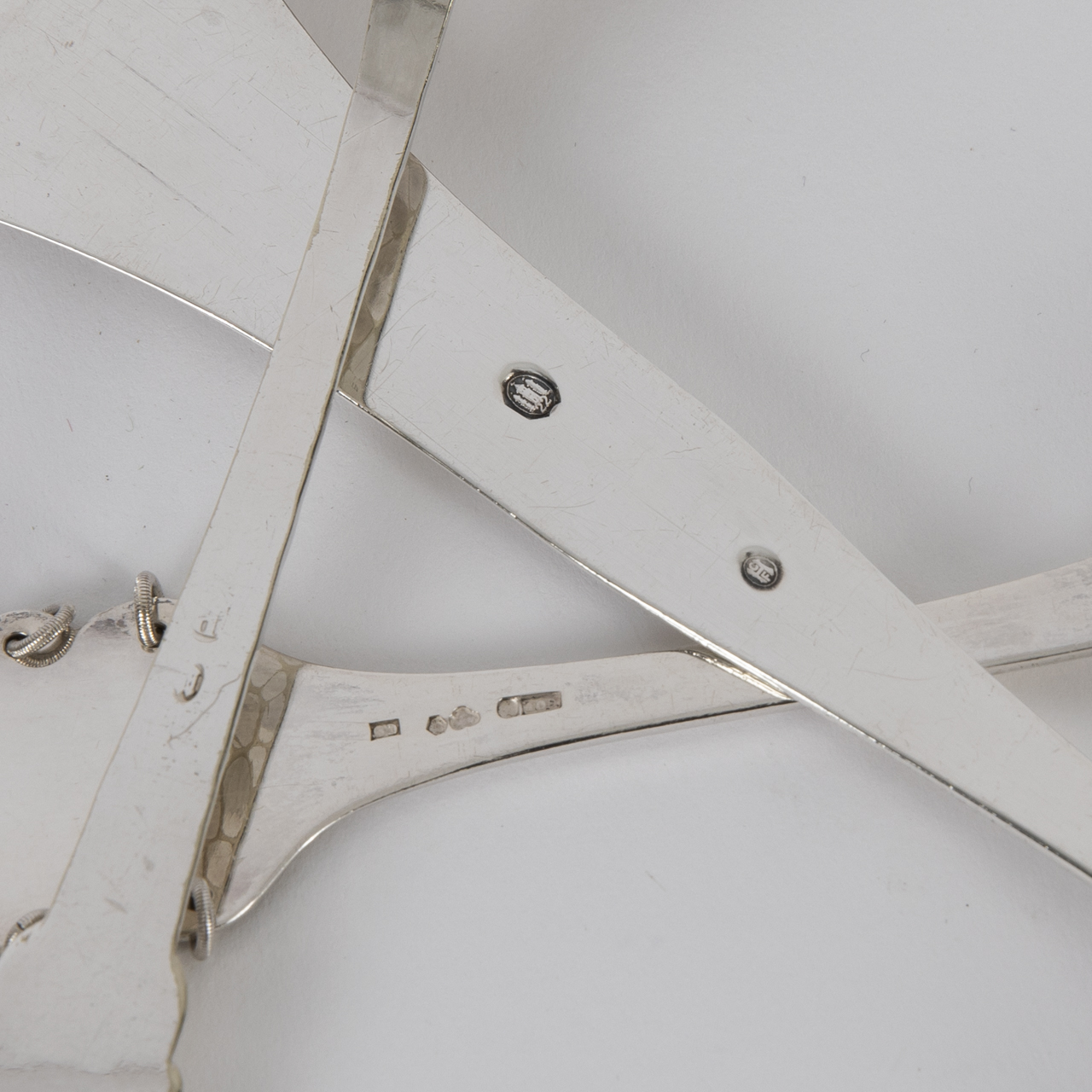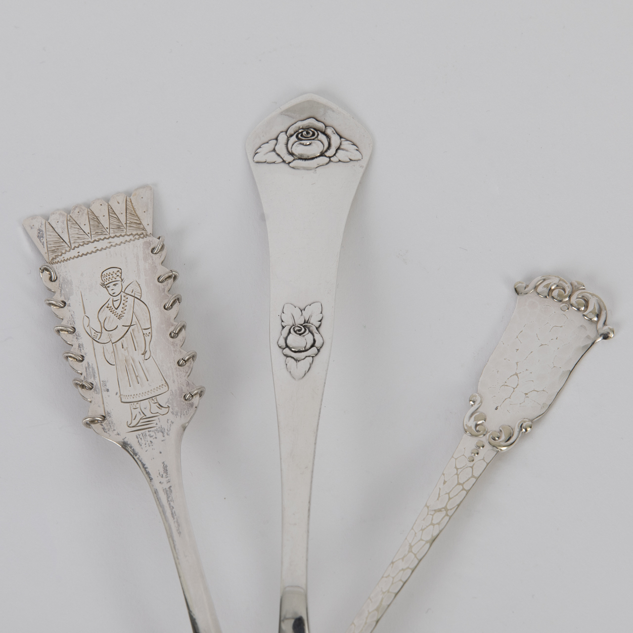 Silberlegierung; Gesamtgewicht: ca. 164 g; dreiteiliges Konvolut Löffel bestehend aus: 1) Vorlegelöffel mit trapezförmiger Laffe mit Ornamentaldekor und breiter werdendem Stiel mit Hammerschlagdekor; rückseitig am Stiel zwei verschlagene Punzen; Länge: ca. 19 cm. 2) Vorlegelöffel mit fein ziselierter Laffe mit Darstellung eines Jägers und Vieh sowie breiter Handhabe mit Abbildung einer Person, seitlich gerahmt von feinen Ringen und nach oben geometrisch abgeschlossen; rückseitig am Stiel gestempelt mit schwedischen Punzen, u. a. Jahresstempel 1953; Länge: ca. 21 cm. 3) Kloßlöffel mit erhabenem Rosendekor an Stiel und Handhabe; rückseitig am Stiel gestempelt mit Stadtmarke Kopenhagen und Beschaujahr (19)22 sowie Beschauzeichen von Christian F. Heise; Länge: ca. 25 cm. Altersbedingte Gebrauchsspuren.