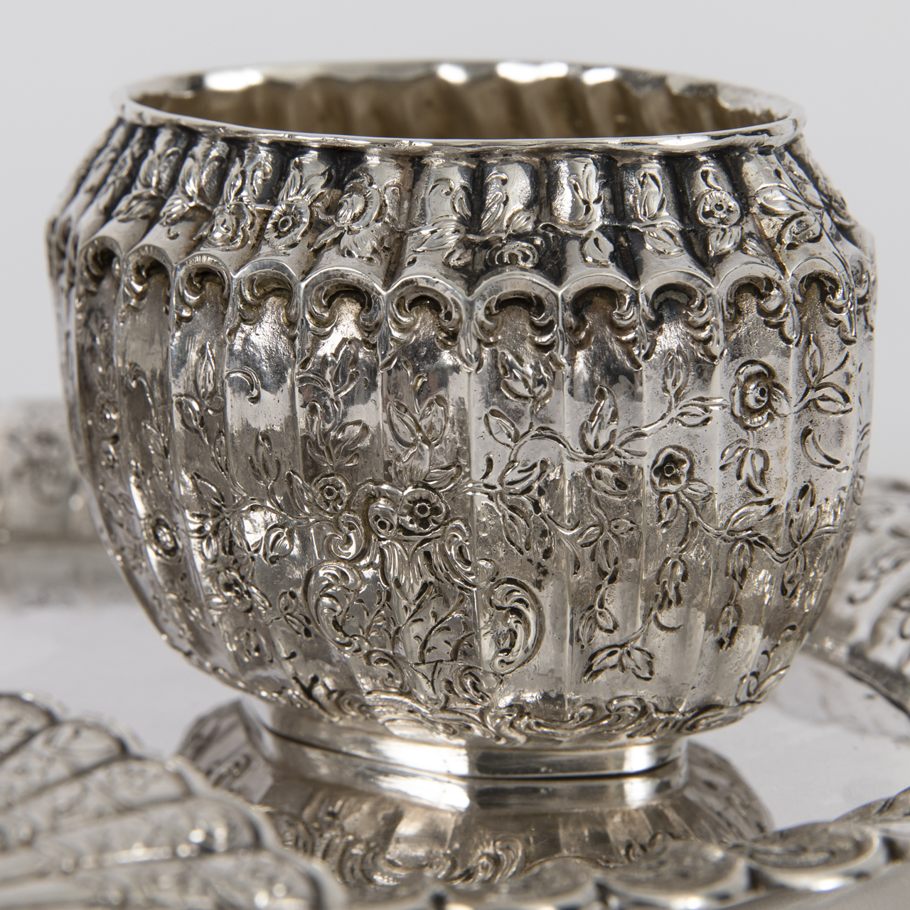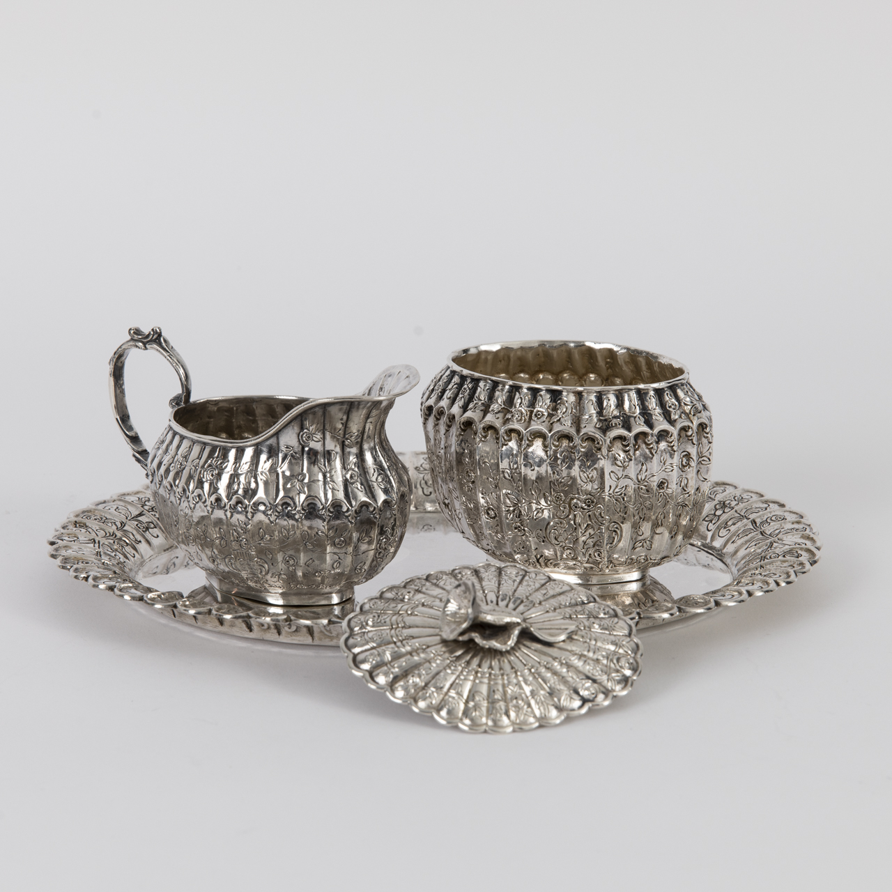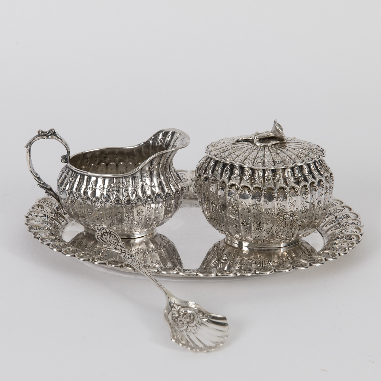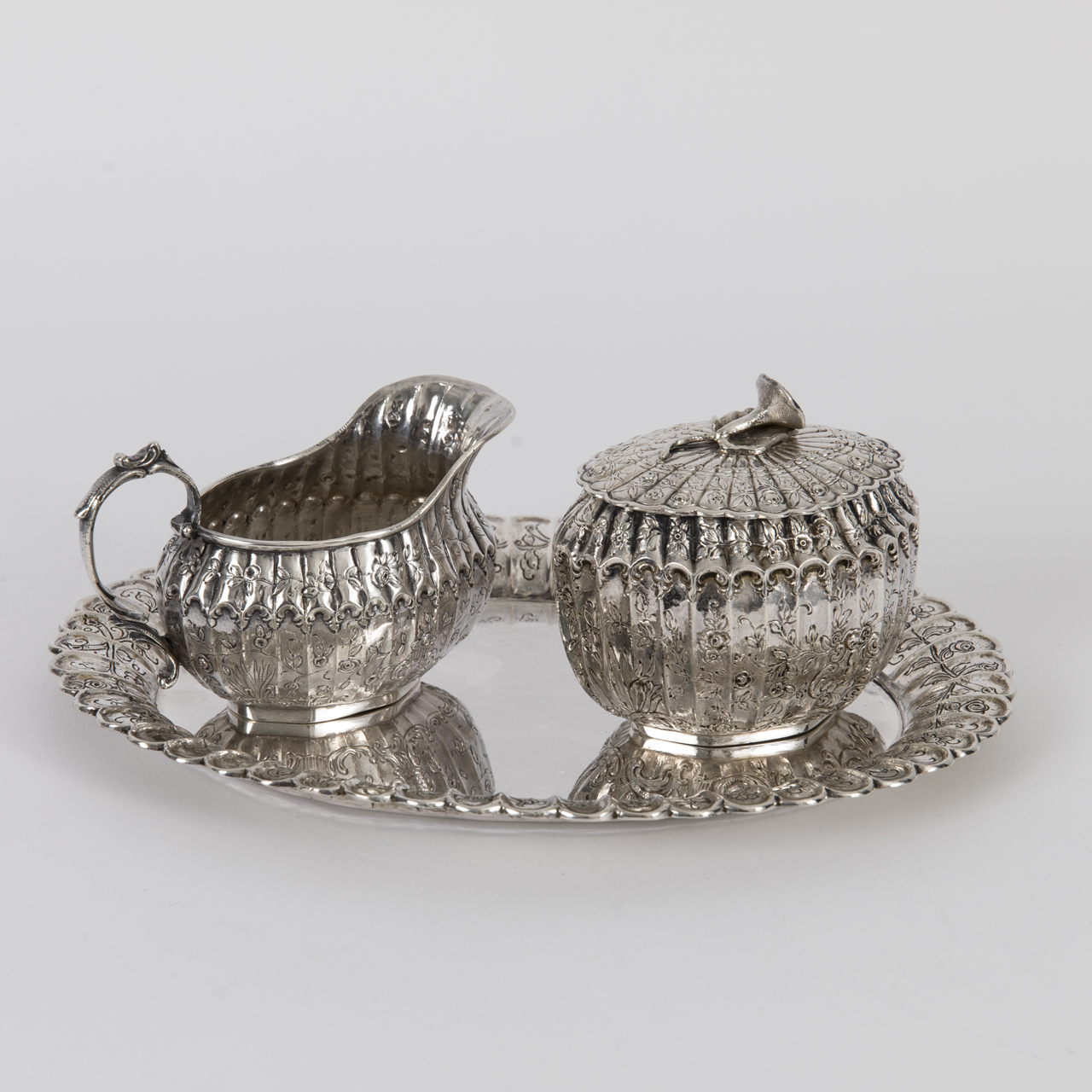 800/-Silber; Gesamtgewicht: ca. 586 g; Service bestehend aus: 1) Rahmgießer in oval gebauchter Form mit senkrecht godronierter Wandung und Floraldekor, hoch angesetztem großen Ohrenhenkel und breitem Ausguss; Höhe: ca. 7,2 cm. 2) Zuckerdose in oval gebauchter Form mit senkrecht godronierter Wandung und Floraldekor, abnehmbarem Deckel mit wellenförmigem Randabschluss und Handhabe in Form einer feinen Blüte; Höhe: ca. 6,7 cm. Dazu ein Löffel mit muschelförmiger Laffe und Handhabe in Floraldekor; Länge: ca. 13,8 cm. 3) Anbiettablett mit ovalem Spiegel und ausgestellter Fahne mit umlaufendem wellenförmigem Randabschluss und Floraldekor; Maße: ca. 24 x 18 cm. Alle Teile in altersbedingtem Gebrauchszustand; alle Teile mit Feingehaltsstempel versehen, Tablett mit ungedeuteter Punze; alle Teil in altersbedingtem Gebrauchszustand und mit Gebrauchsspuren.