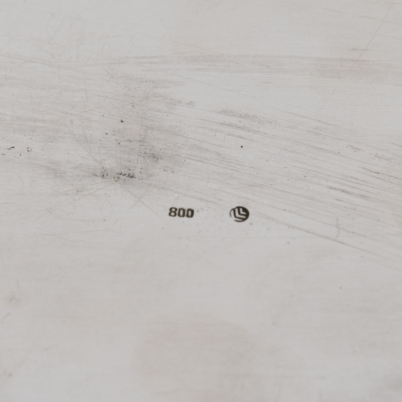 800 silver; total weight: approx. 586 g; service consisting of: 1) cream jug in oval bulbous form with vertically gadrooned wall and floral décor, high-set large ear-shaped handle and wide spout; height: approx. 7.2 cm. 2) sugar bowl in oval bulbous form with vertically gadrooned wall and floral décor, detachable lid with wavy rim and handle in the form of a delicate flower; height: approx. 6.7 cm. Accompanied by a spoon with shell-shaped bowl and handle with floral décor; length: approx. 13.8 cm. 3) serving tray with oval mirror and flared rim with surrounding wavy border and floral décor; dimensions: approx. 24 x 18 cm. All parts in condition consistent with age; all parts with fineness mark, tray with indistinct punch; all parts in condition consistent with age and with signs of use