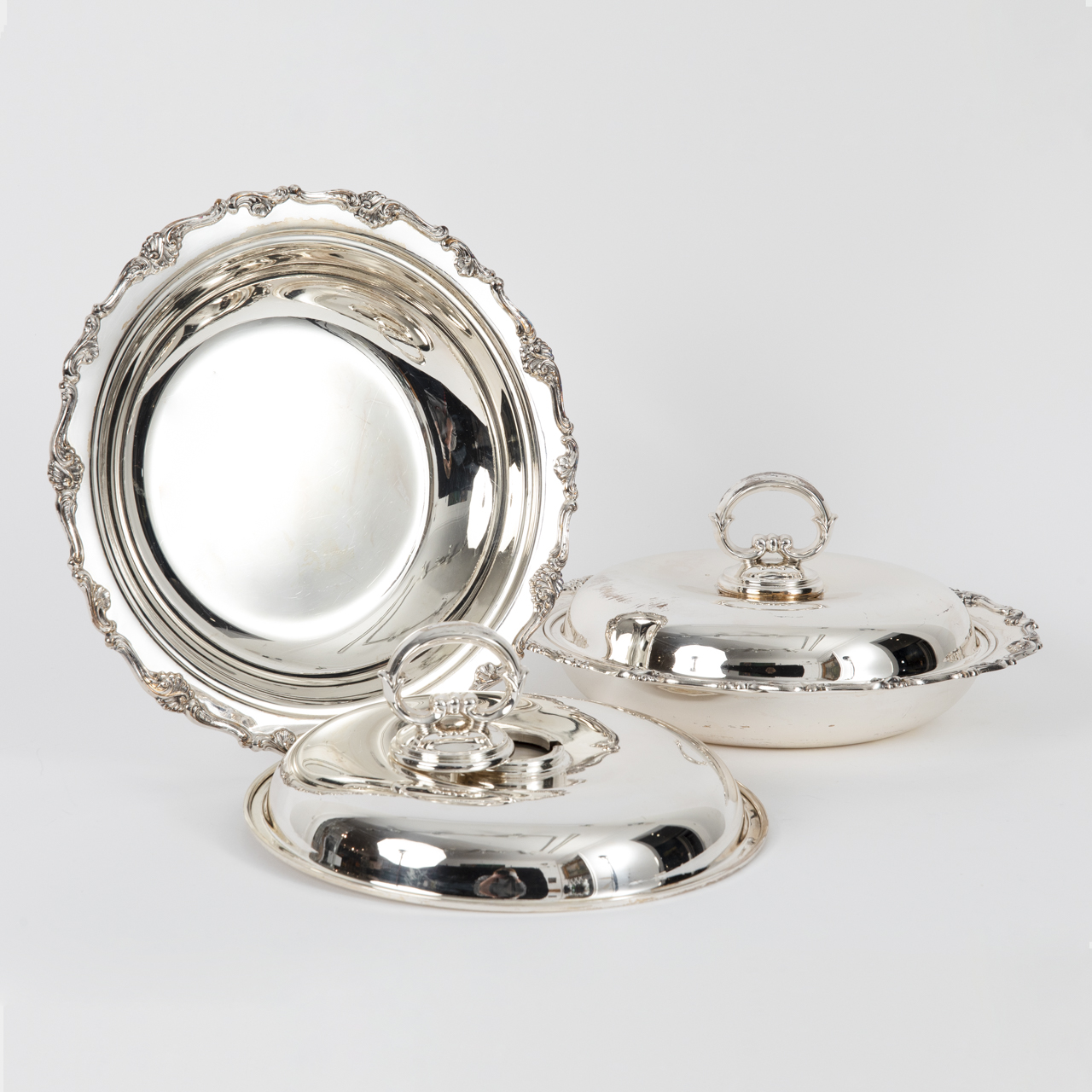 925/- Silber; Gewicht: ca. 1920 g; Paar runde Deckelschüsseln mit leicht ausgestellter Fahne, Rand mit umlaufendem Rocaille-Dekor und abnehmbaren, gewölbten Deckeln mit abdrehbarer Handhabe in geschwungener Form; anlaufgeschützt; alle sechs Teile mit Herstellerpunze und Feingehaltsstempel versehen; beide Schüsseln mit Anlaufschutzrückständen und altersbedingten Gebrauchsspuren, ein Deckel mit deutlichen Kratzspuren unter dem Anlaufschutz; Höhe: ca. 12 cm; Durchmesser: ca. 27 cm.
