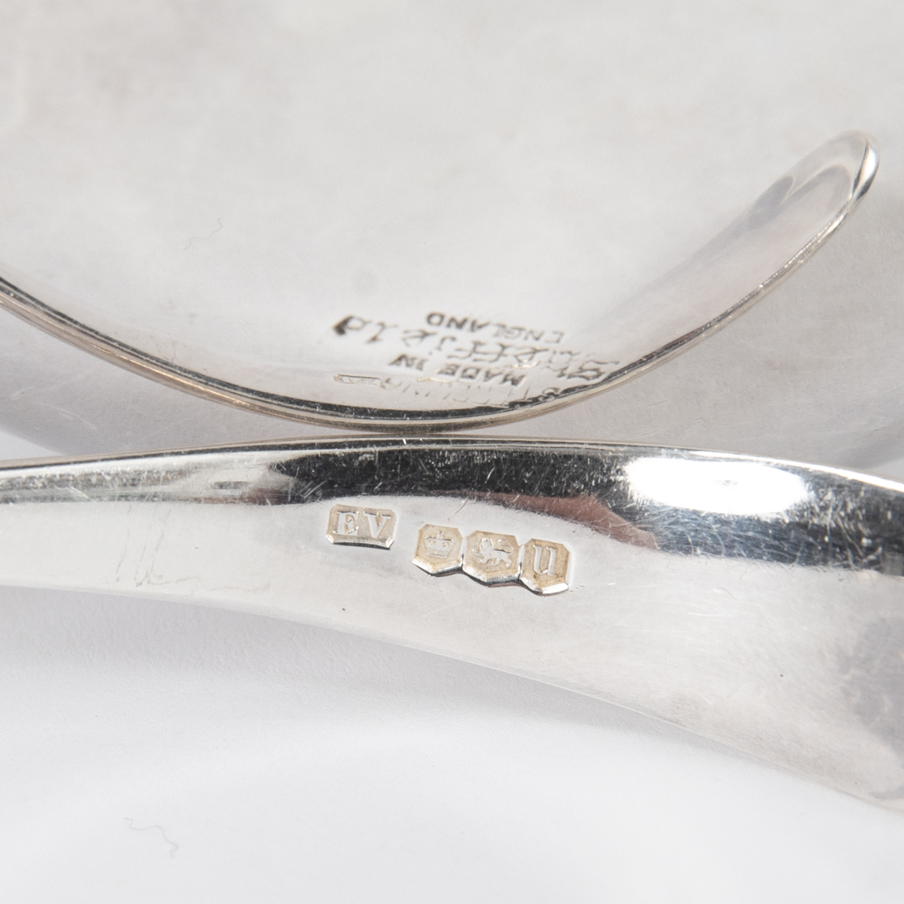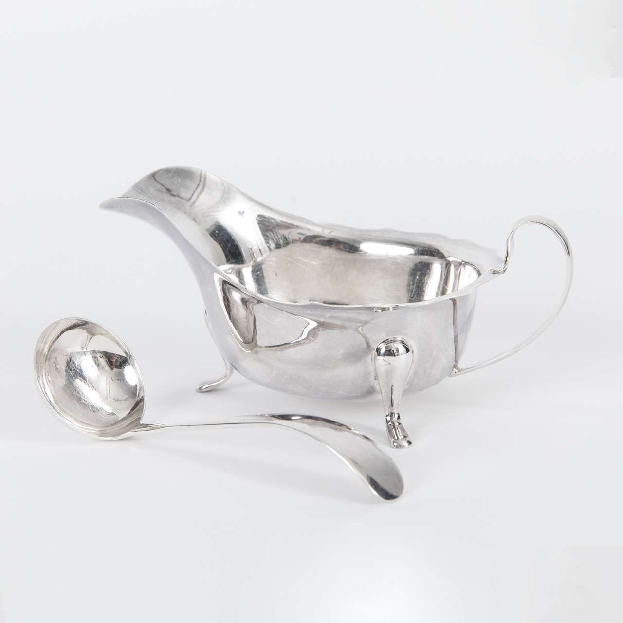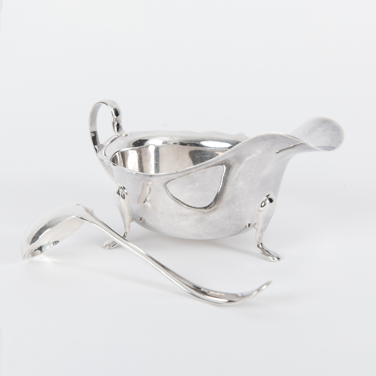Sterling Silber; Gesamtgewicht: ca. 145 g; Saucière auf drei ausgestellten Standfüßen mit gebauchter Wandung, leicht ausgestelltem gezacktem und gewelltem Öffnungsrand, breitem Ausguss und rückseitigem Ohrenhenkel; Höhe: ca. 6,9 cm. 2) Kleiner Schöpflöffel mit kreisrunder Laffe und geschwungener Handhabe. Beides rückseitig der Laffe oder seitlich der Wandung gestempelt mit Lion Passant, Stadtmarke, Herstellerpunze und Jahresbuchstaben (Löffel: 1937, Saucière: 1949), Saucière unterseitig mit weiteren Punzen versehen; altersbedingte Gebrauchsspuren.