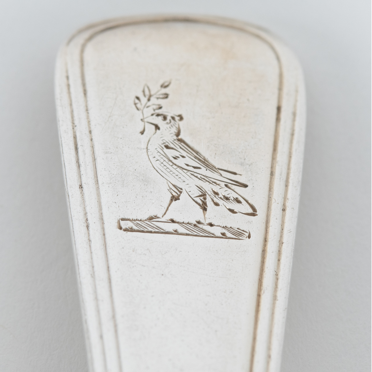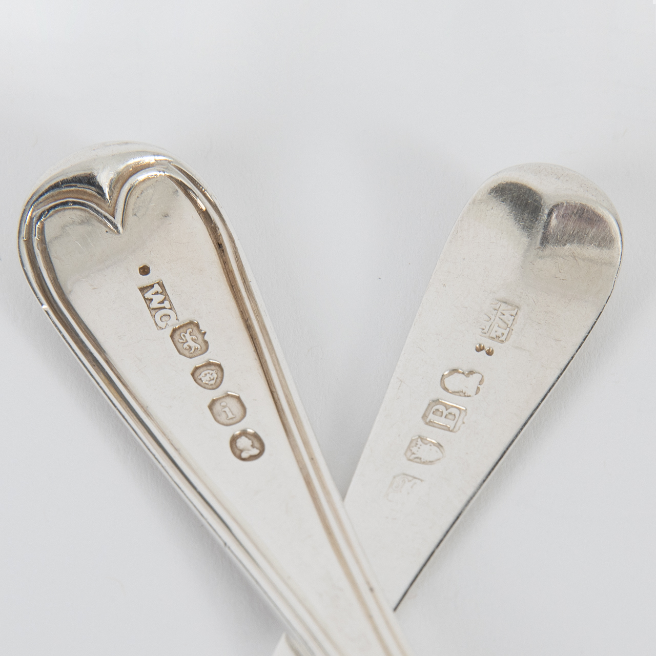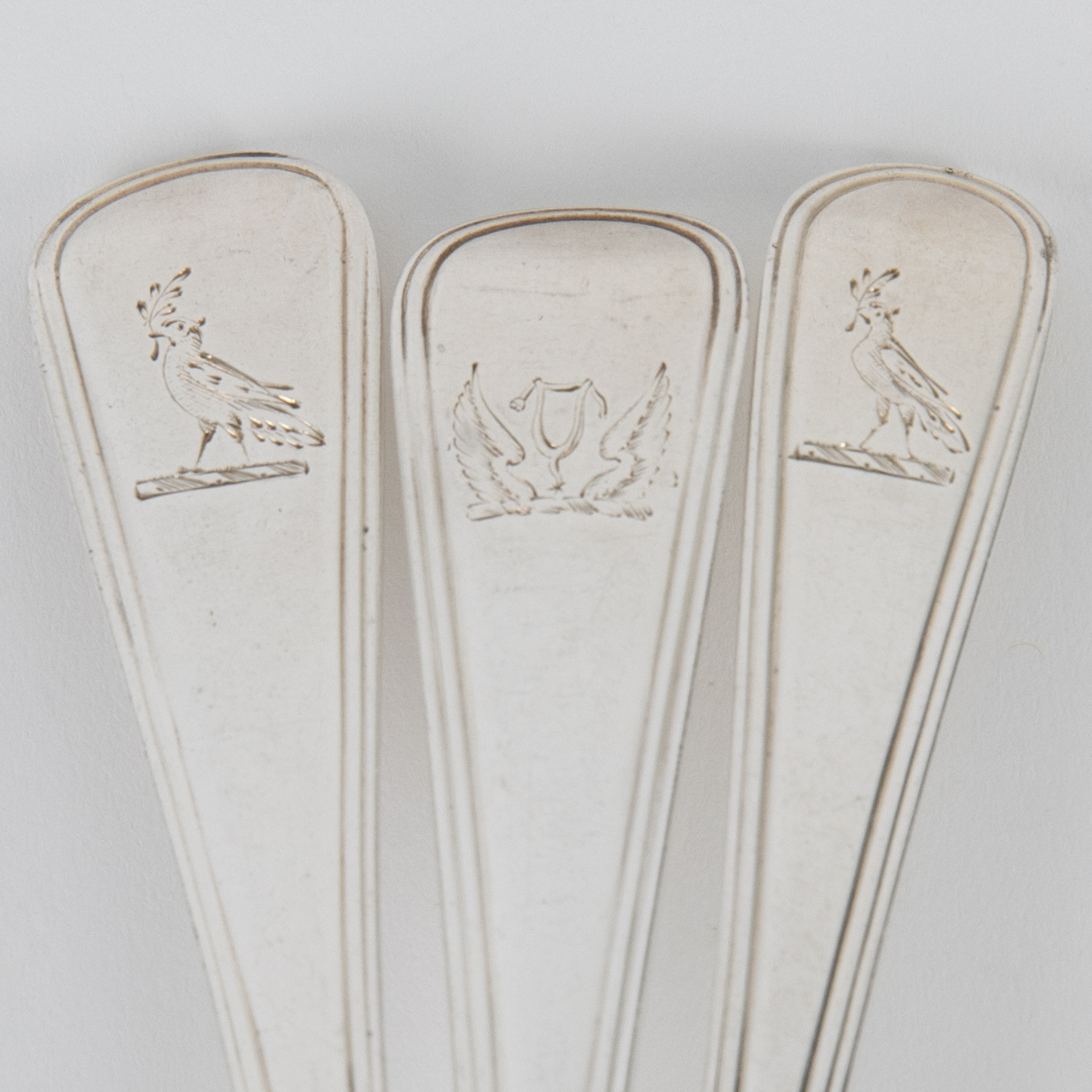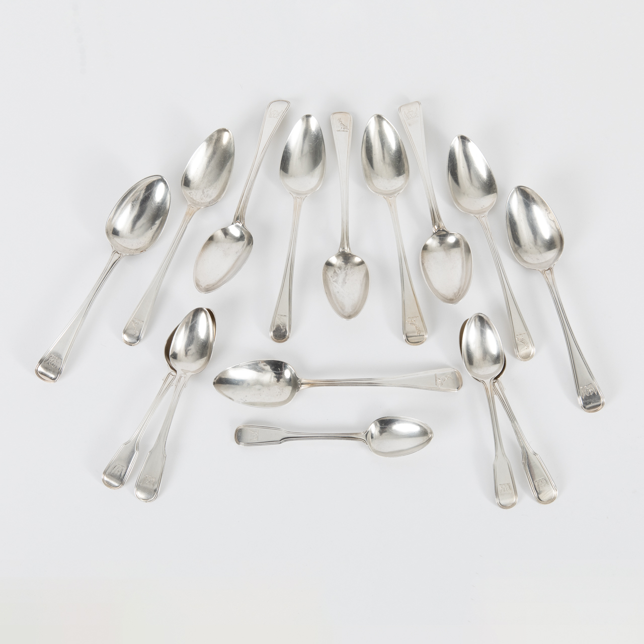 Sterling Silber; Gesamtgewicht: ca. 500 g; Konvolut aus 10 Dessert- und 5 Teelöffel teilweise mit Spatenmuster, Alt-Englisch und verschiedenen ornithologischen Gravuren am Stilende; rückseitig gestempelt mit Lion Passant, Duty Marke, Stadtmarke London, Jahresbuchstaben (1790er - 1880er Jahre) und Meistermarken (Thomas Blake, 4 x William Chawner II, 2 x Thomas Dicks, 2 x William Eley, William Fearn & William Chawner II, 2 x William Eley & William Fearn, Thomas Shepard und George Aldwinckle (eine Punze verschlagen)); altersbedingte Gebrauchsspuren; Länge: von ca. 13,8 cm bis ca. 17,7 cm.