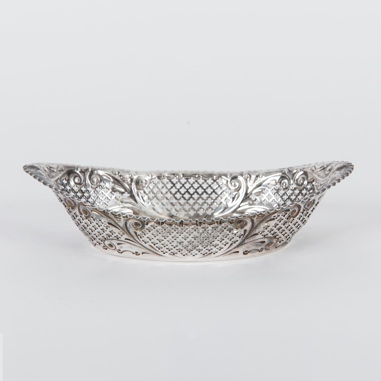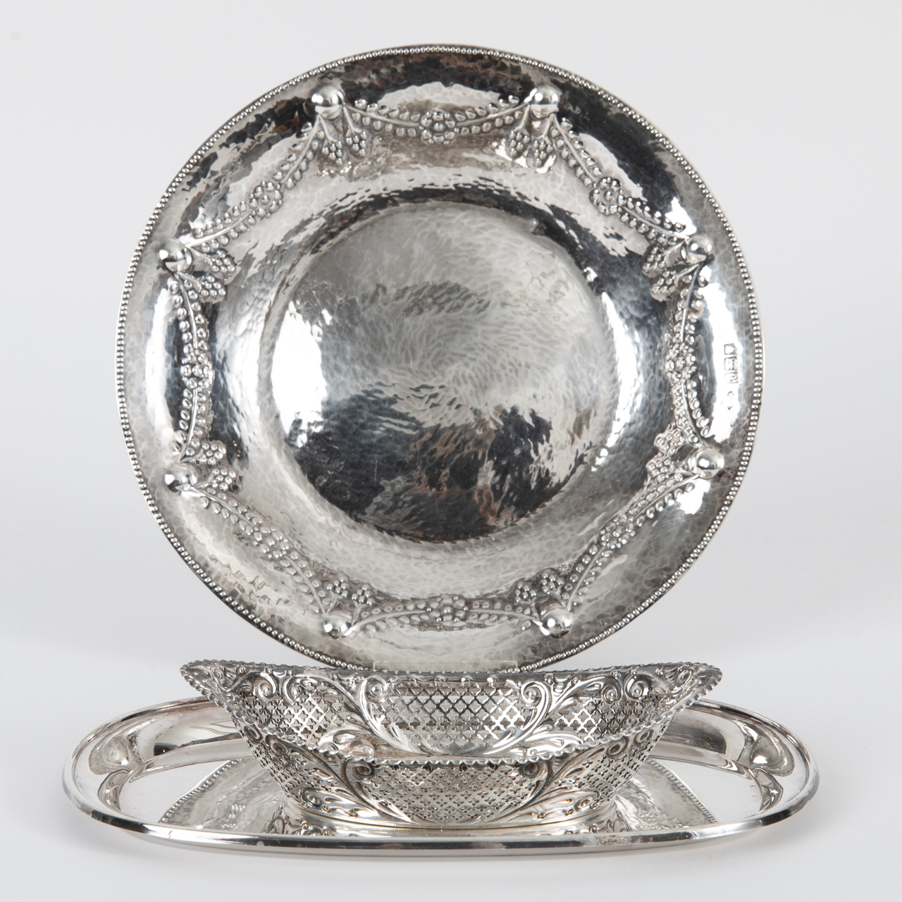 Sterling and 800/- silver; total weight: approx. 355 g; three-piece group comprising: 1) Boat-shaped bowl with pierced wall featuring ornamental and floral decoration and an oval well; underside stamped with lion passant, London town mark, date letter 1872 and struck maker’s mark; dimensions: approx. 13.2 x 7 cm. 2) Serving bowl with hammered decoration, scalloped rim with encircling festoon, vine and floral decoration, and a fine continuous beaded border to the edge; rim stamped with lion passant, London town mark, date letter 1914 and maker’s mark Philip Frederick Alexander; diameter: approx. 18.8 cm. 3) Oval miniature tray with slightly flared rim; well stamped with crescent and crown, fineness mark “800” and unidentified maker’s mark; slightly indented rim over approx. 1 cm; dimensions: approx. 19.4 x 11.6 cm. All pieces with age-related signs of wear and oxidation residues.