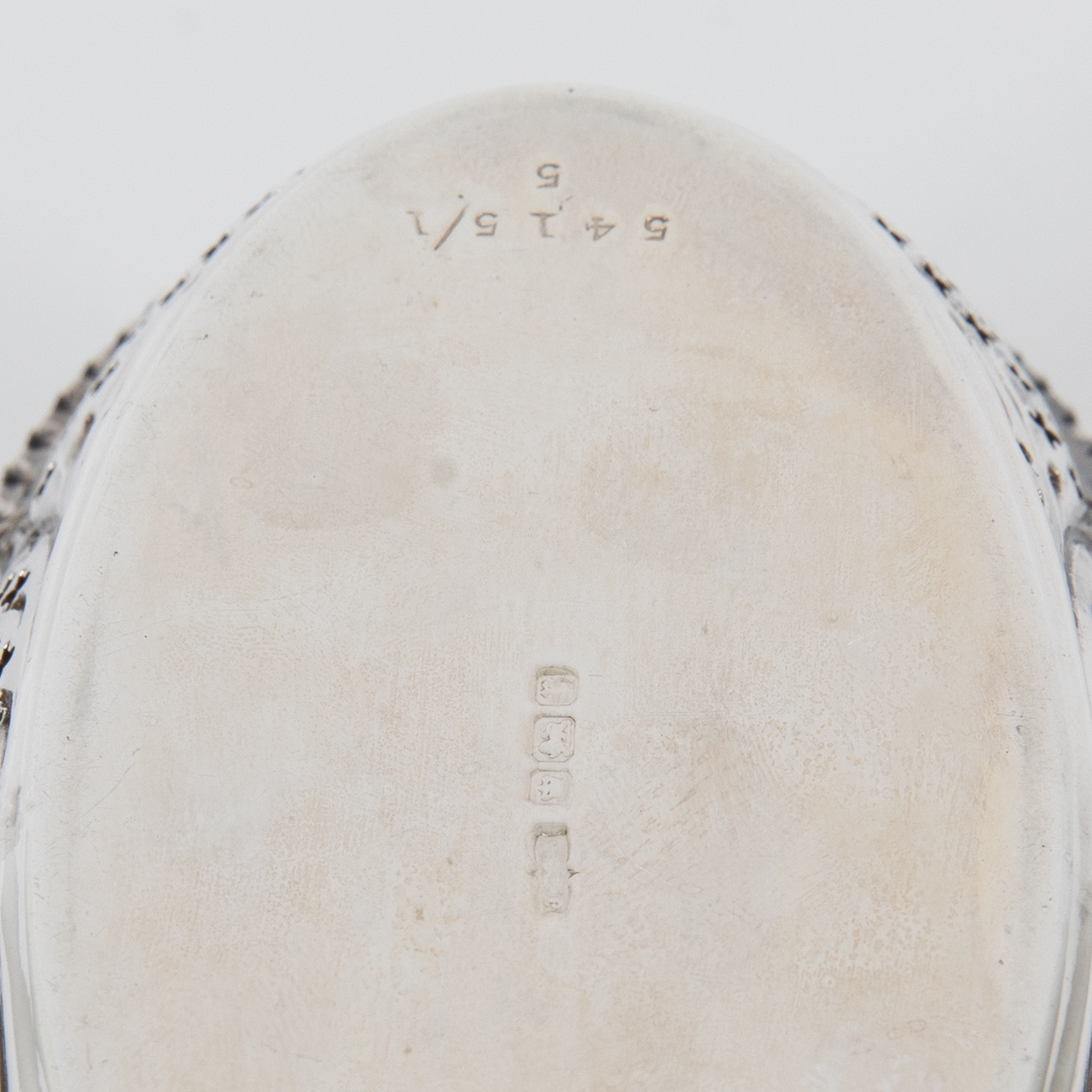 Sterling- und 800/- Silber; Gesamtgewicht: ca. 355 g; 3-teiliges Konvolut bestehend aus: 1) Schälchen in Schiffchenform mit durchbrochen gearbeiteter Wandung mit ornamentalen und floralen Dekoren und ovalem Spiegel; unterseitig gestempelt mit Lion Passant, Stadtmarke London, Jahresmarke 1872 und verschlagener Meistermarke; Maße: ca. 13,2 x 7 cm. 2) Anbietschälchen mit Hammerschlagdekor, geschweifter Fahne mit umlaufendem Feston-, Wein- und Floraldekor und am Rand feinem umlaufendem Perlranddekor; auf der Fahne gestempelt mit Lion Passant, Stadtmarke London, Jahresmarke 1914 und Meistermarke Philip Frederick Alexander; Durchmesser: ca. 18,8 cm. 3) Ovales Miniaturtablett mit leicht ausgestellter Fahne; im Spiegel gestempelt mit Halbmond und Krone, Feingehaltsstempel „800“ und ungedeuteter Meistermarke; leicht eingedrückter Rand über ca. 1 cm; Maße: ca. 19,4 x 11,6 cm. Alle Teile mit altersbedingten Gebrauchsspuren und Oxidationsrückständen.