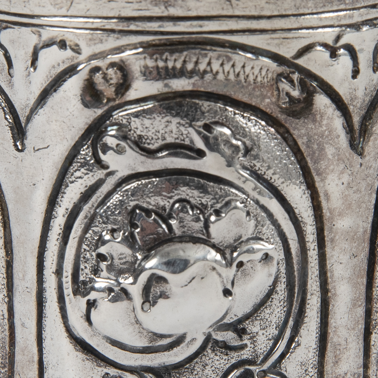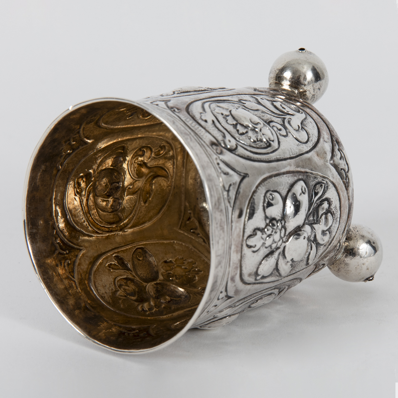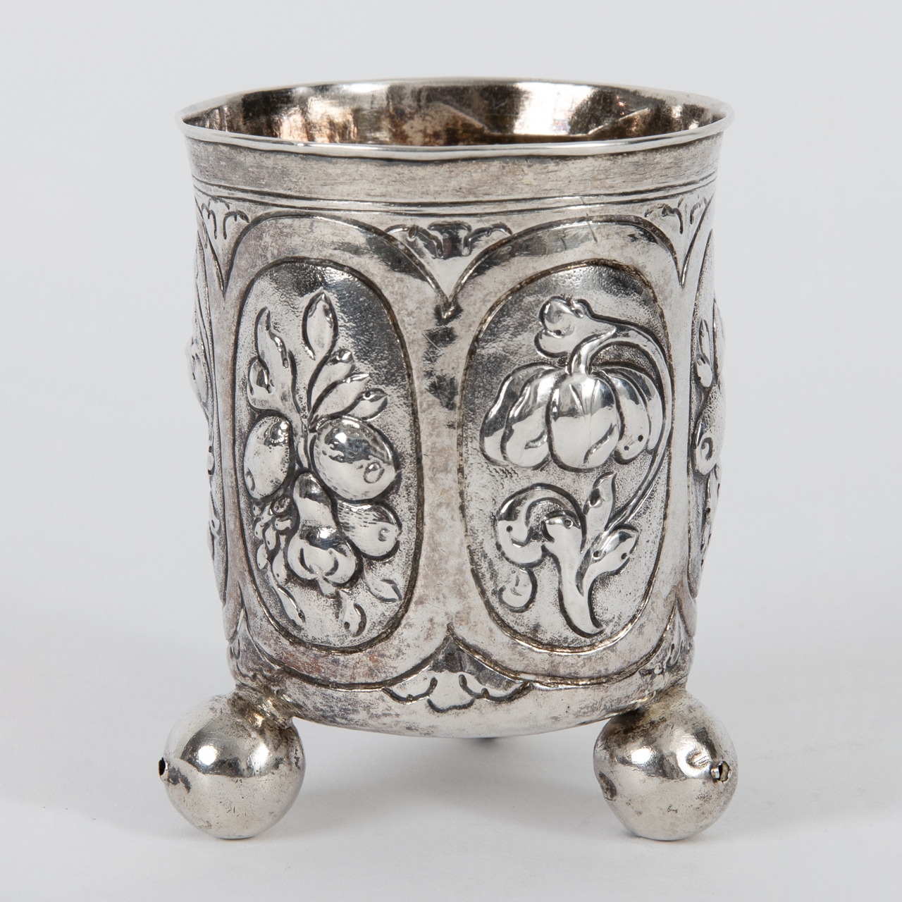 Silver alloy; weight: approx. 70 g; goblet standing on three hollow ball feet with straight-sided body and encircling relief fruit and floral decoration arranged in six adjacent oval reserves; remains of gilding; several dents of up to approx. 7 mm in length, age-related signs of wear; upper rim stamped with an unidentified and struck mark and bearing a tremble line; height: approx. 8.4 cm.