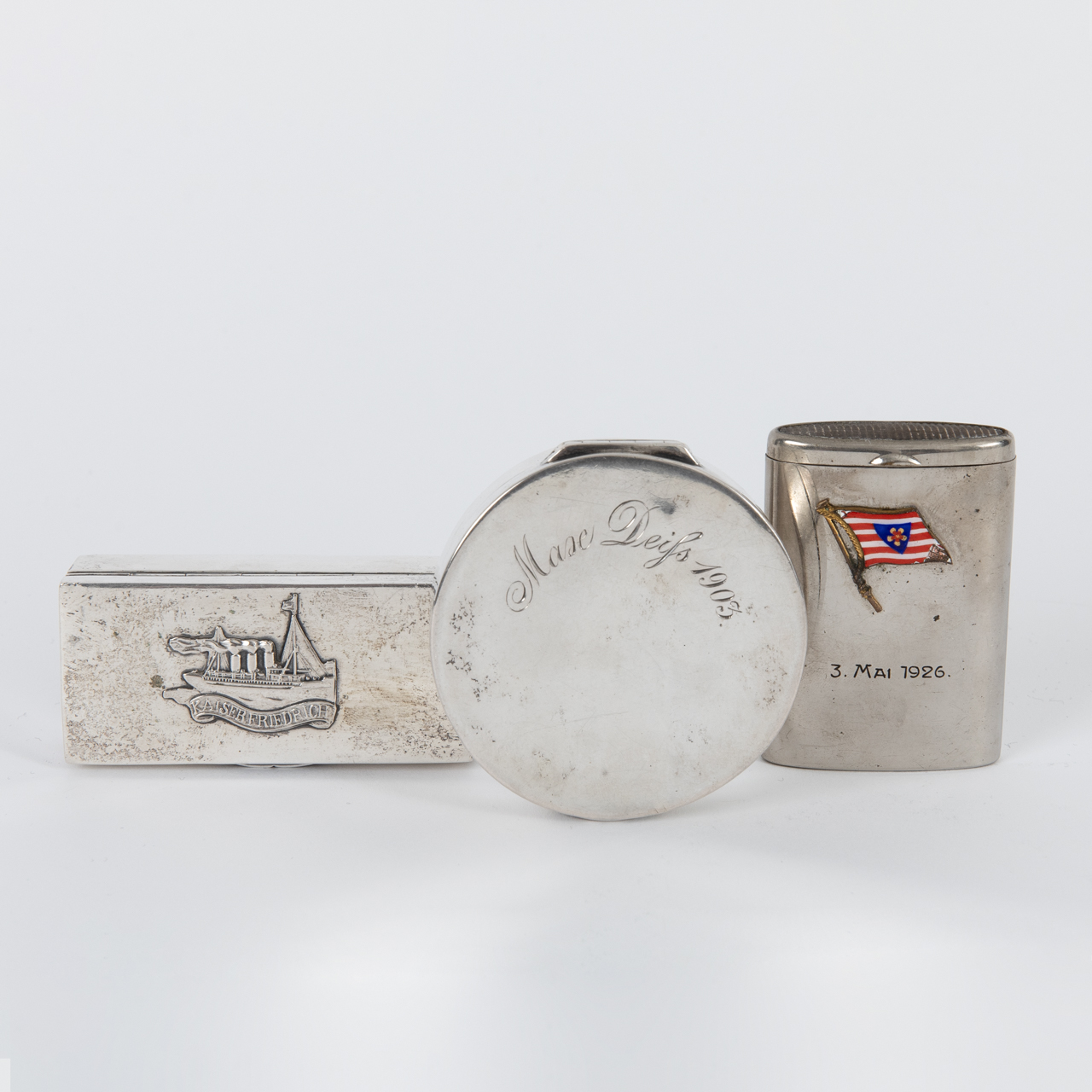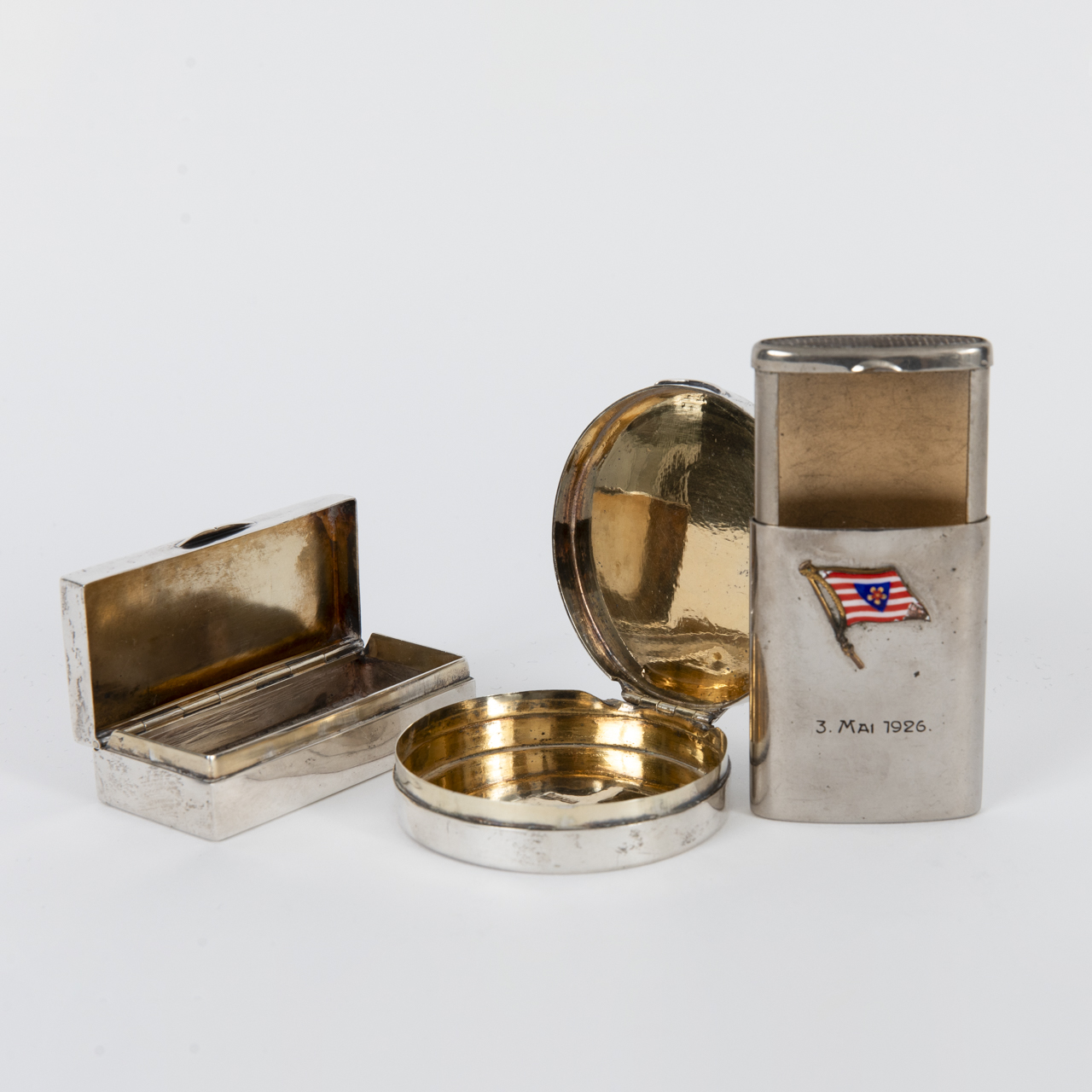 Various silver alloys; total weight: approx. 171 g; three-piece group comprising: 1) Match case of oval-elongated form with sliding gold-coloured insert, thumb grip, striker surface set above, and applied enamel flag of the Allemannia rowing club from Hamburg, below engraved date “3 May 1926”; dimensions: approx. 6.2 x 6.3 x 4.3 cm. 2) Rectangular case with hinged lid, thumb press and raised depiction of the express steamer Kaiser Friedrich on the front; interior with remnants of gilding; dimensions: approx. 2 x 7.2 x 3.5 cm. 3) Circular case with hinged lid and dedications on both sides; interior with remnants of gilding and an unidentified punch; diameter: approx. 6.4 cm. Age-related signs of wear and oxidation residues.